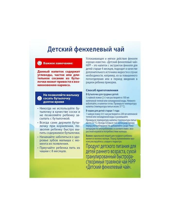 Детский фенхелевый чай HiPP – это быстрорастворимый, легкий в приготовлении напиток с экстрактом фенхеля для детей старше 4 месяцев. Фенхель давно зарекомендовал себя в детском питании. Он нормализует работу желудочно-кишечного тракта, помогает при коликах и метеоризме.