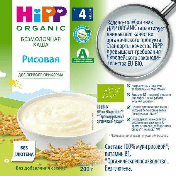 Органическая безмолочная каша HiPP 100% Рисовая идеально подойдет в качестве первого прикорма для малышей с 4 месяцев. Рис обладает низкоаллергенными свойствами и не содержит глютен.