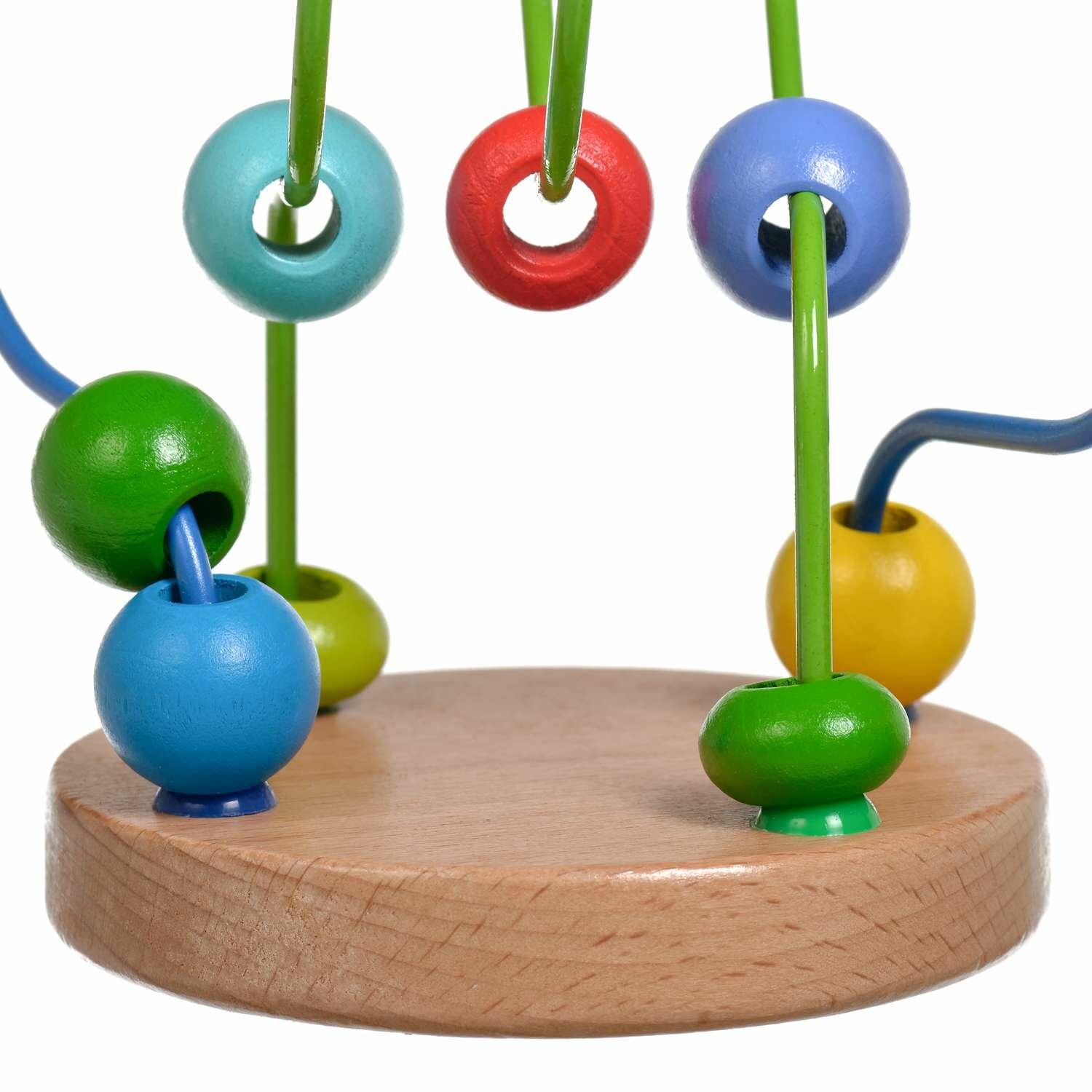 Веселая игрушка в виде небольшого лабиринта представляет собой комбинацию из двух разноцветных проволок, изогнутых в разных плоскостях и закрепленных на деревянном основании. На каждой проволоке нанизаны разноцветные деревянные фигурки различной формы, которые нужно перемещать по этим проволокам. Игра с таким лабиринтом помогает развитию у ребенка внимания, логического и пространственного мышления, а также моторики пальчиков.