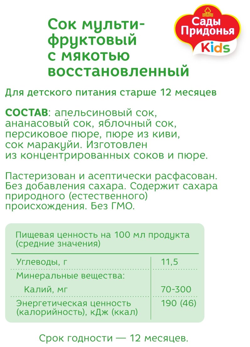 | Состав | апельсиновый сок; ананасовый сок; яблочный сок; персиковое пюре; пюре из киви; сок маракуйи |
