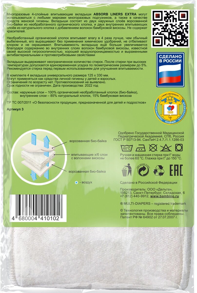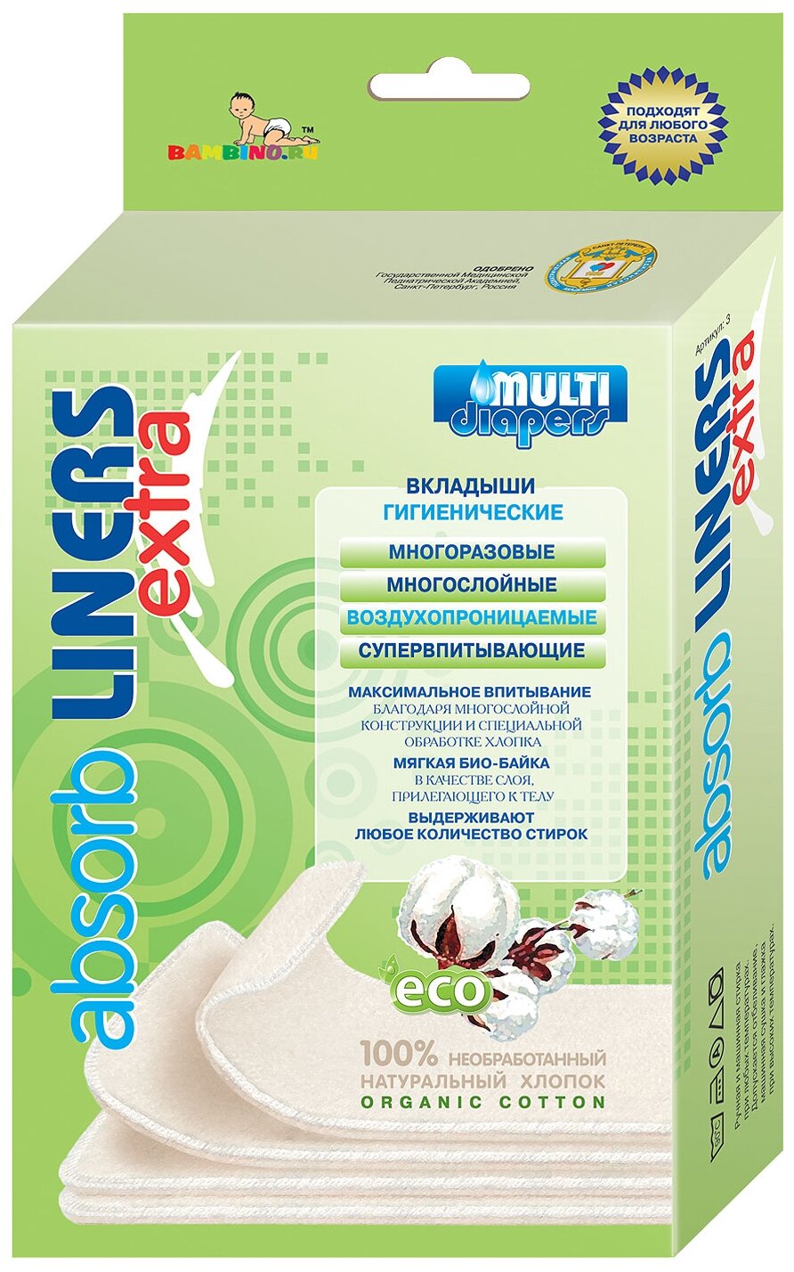 - Вкладыши ABSORB LINERS EXTRA состоят из двух наружных слоёв ворсованной био-байки, изготовленной из необработанного органического хлопка, и двух внутренних впитывающих слоёв из натурального хлопка с добавлением волокон бамбуковой вискозы.