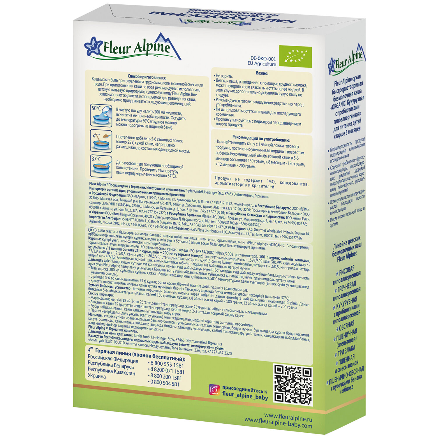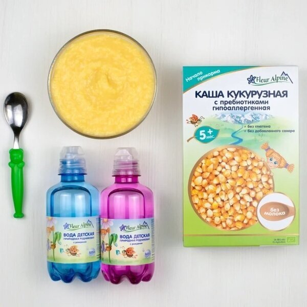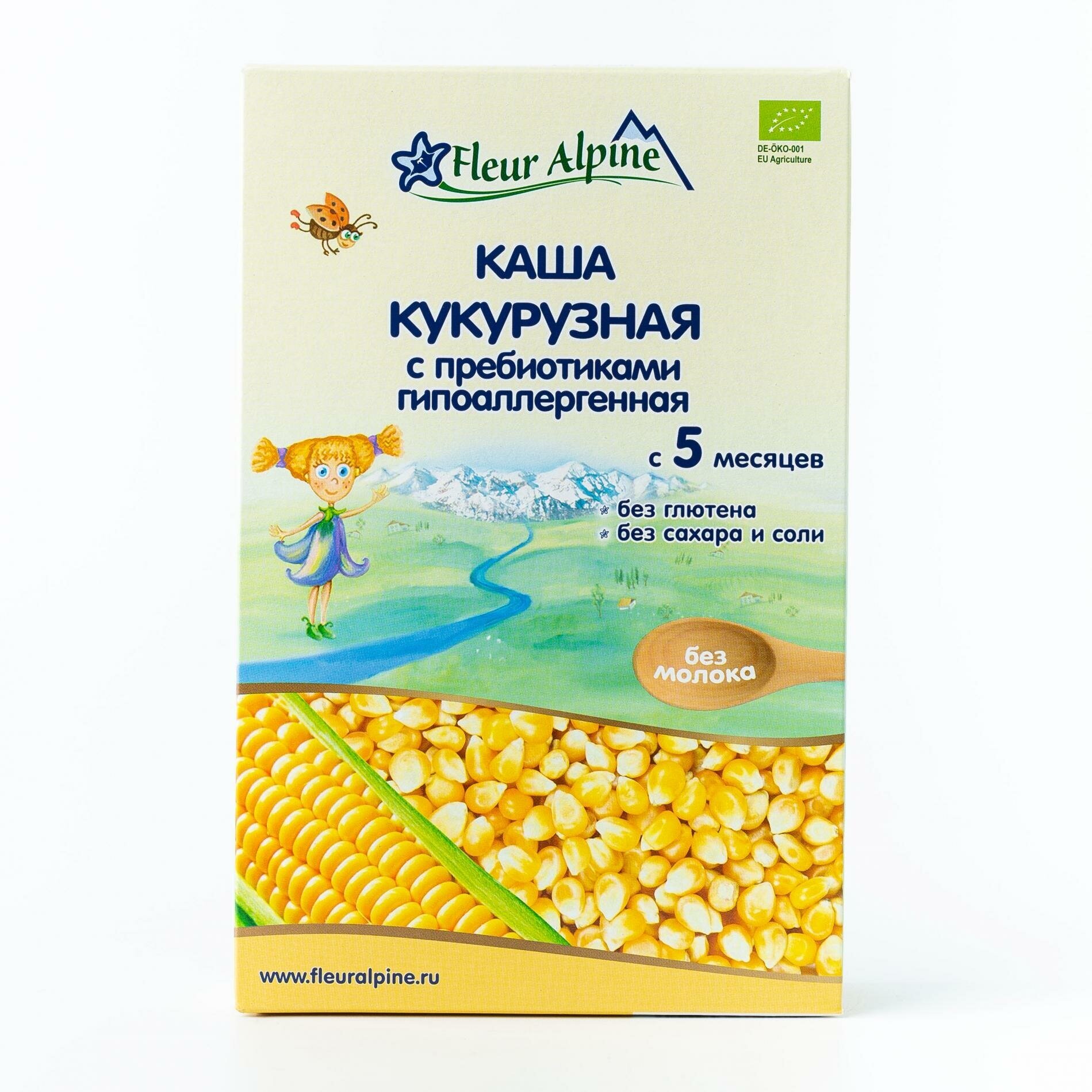 Каша безмолочная Fleur Alpine Кукурузная с пребиотиками гипоаллергенная для детей старше 5 месяцев. Гипоаллергенность подтверждена клиническими исследованиями. Без глютена. Не содержит следов молока. Без добавленного сахара. Разводится легко, быстро и без комочков.