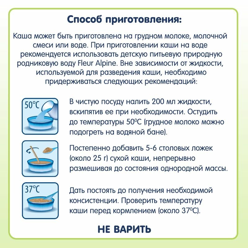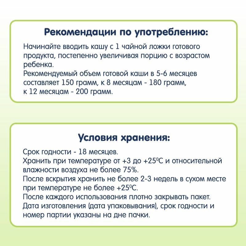 | Способ приготовления | В чистую посуду налить 200 мл жидкости, предварительно остудив ее до температуры 50°С. Постепенно добавить 5-6 столовых ложек (около 25 г) сухой каши, непрерывно размешивая до состояния однородной массы. Дать постоять до получения необходимой консистенции. Проверить температуру каши перед кормлением (около 37°С). Каша может быть приготовлена на грудном молоке, молочной смеси или воде. Начинайте вводить кашу с 1 чайной ложки готового продукта, постепенно увеличивая порцию с возрастом ребенка. Рекомендуемый объем готовой каши в 4-6 месяцев составляет 150 г, к 8 месяцам - 180 г, к 12 месяцам – 200 г. Не используйте остатки каши для последующего кормления. |