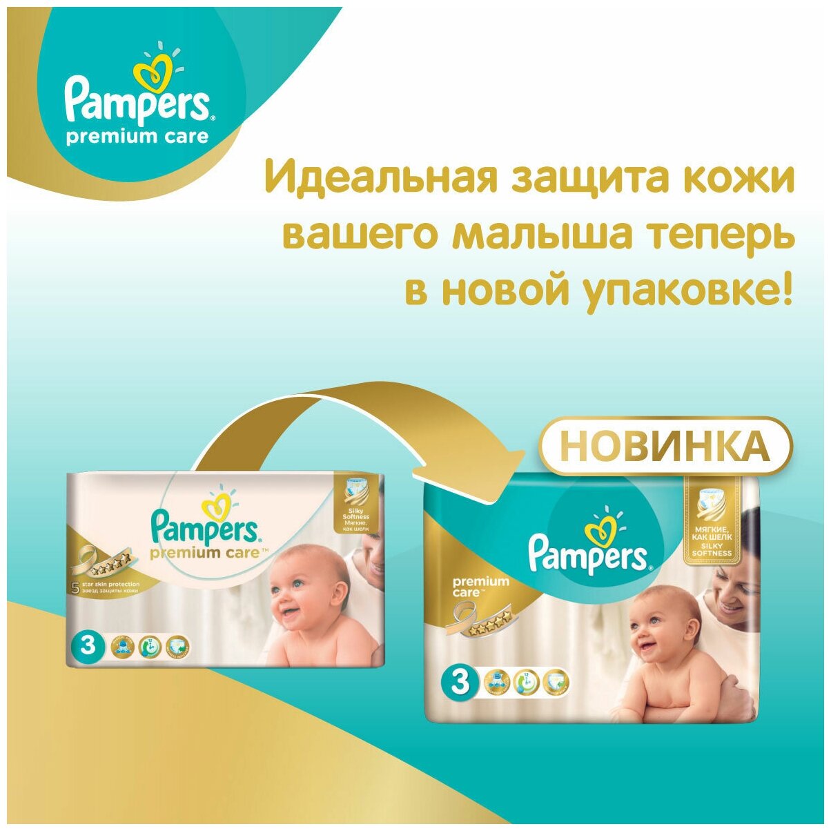 Новые Pampers Premium Care — наши лучшие подгузники, которые обеспечивают защиту кожи “5 звезд”, и дарят непревзойденную мягкость шелка. Это первые и единственные подгузники с впитывающими каналами, обеспечивающими до 12 часов сухости.