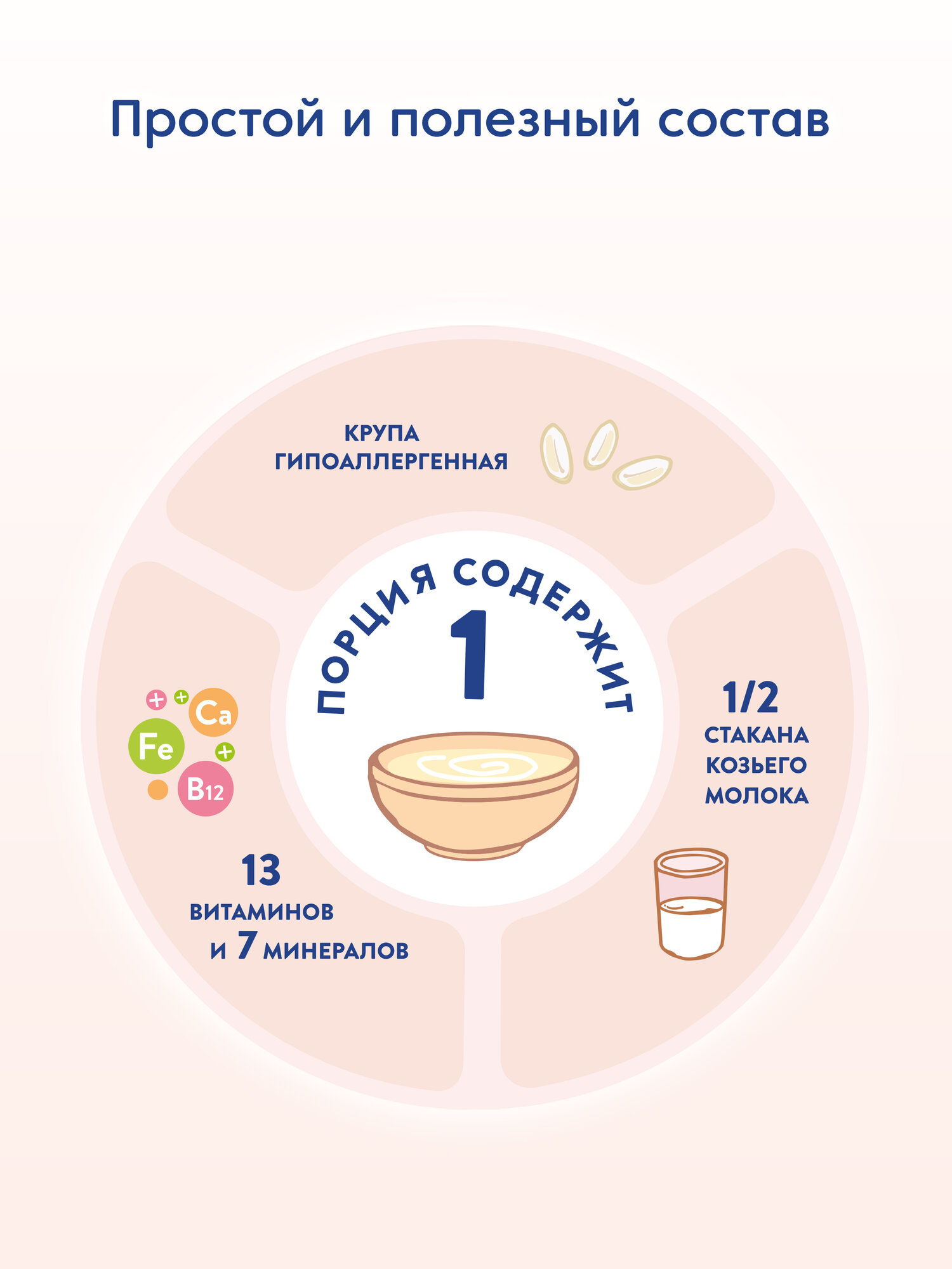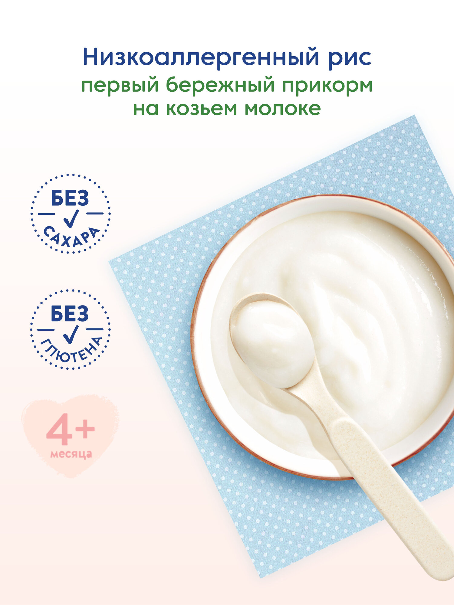 | Состав | рисовая крупа, козье молоко (32%), комплекс минералов (карбонат кальция, пирофосфат железа, йодид калия, сульфат цинка), комплекс витаминов |