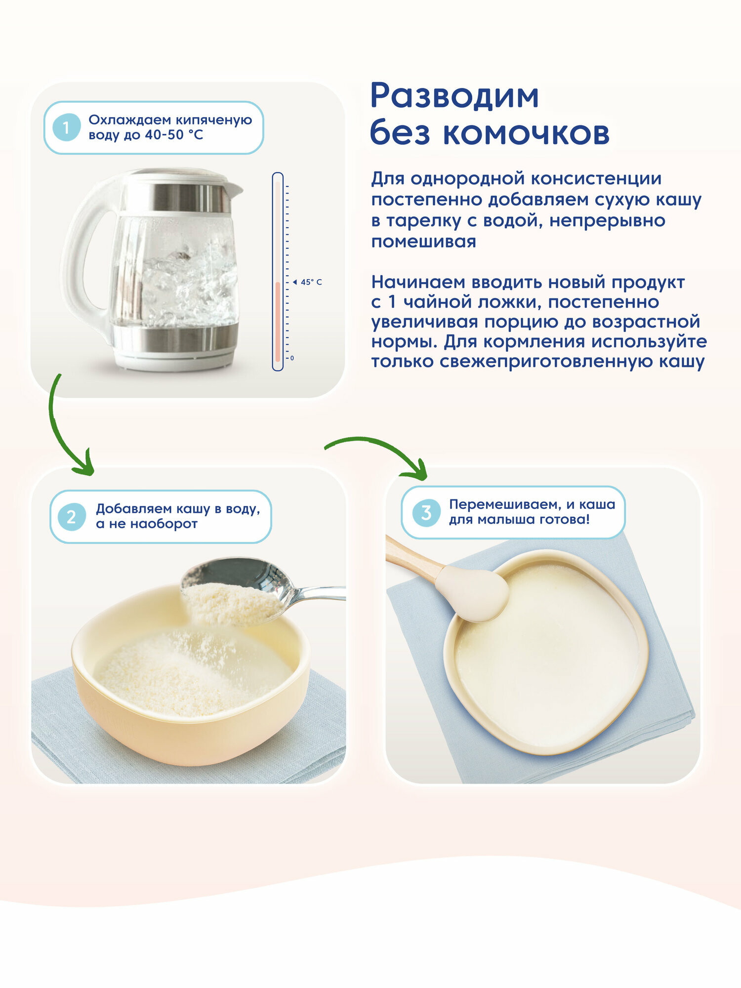 Важная информация. Перед введением нового прикорма проконсультируйтесь с вашим педиатром. Начинайте вводить новый продукт с небольшого количества, постепенно увеличивая порцию до возрастной нормы. Для кормления используйте только свежеприготовленную кашу. Оставшаяся после кормления порция не подлежит использованию.