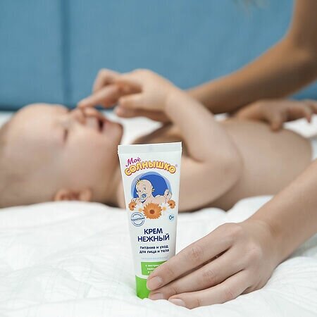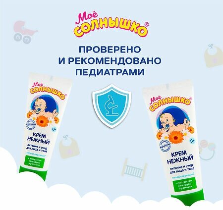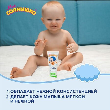 Детский питательный крем Моё солнышко нежной консистенции для ухода за кожей лица и тела ребенка. Легко наносится, быстро впитывается, не оставляя ощущения жирности. Содержит комплекс масел ши и кокоса, D-пантенол, экстракты цветков календулы и ромашки. Делает кожу малыша мягкой и нежной.