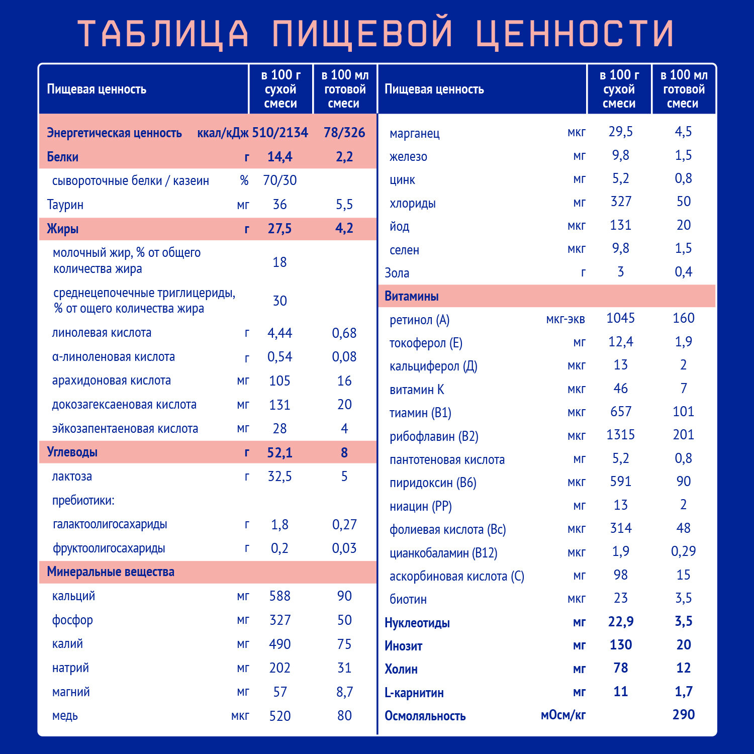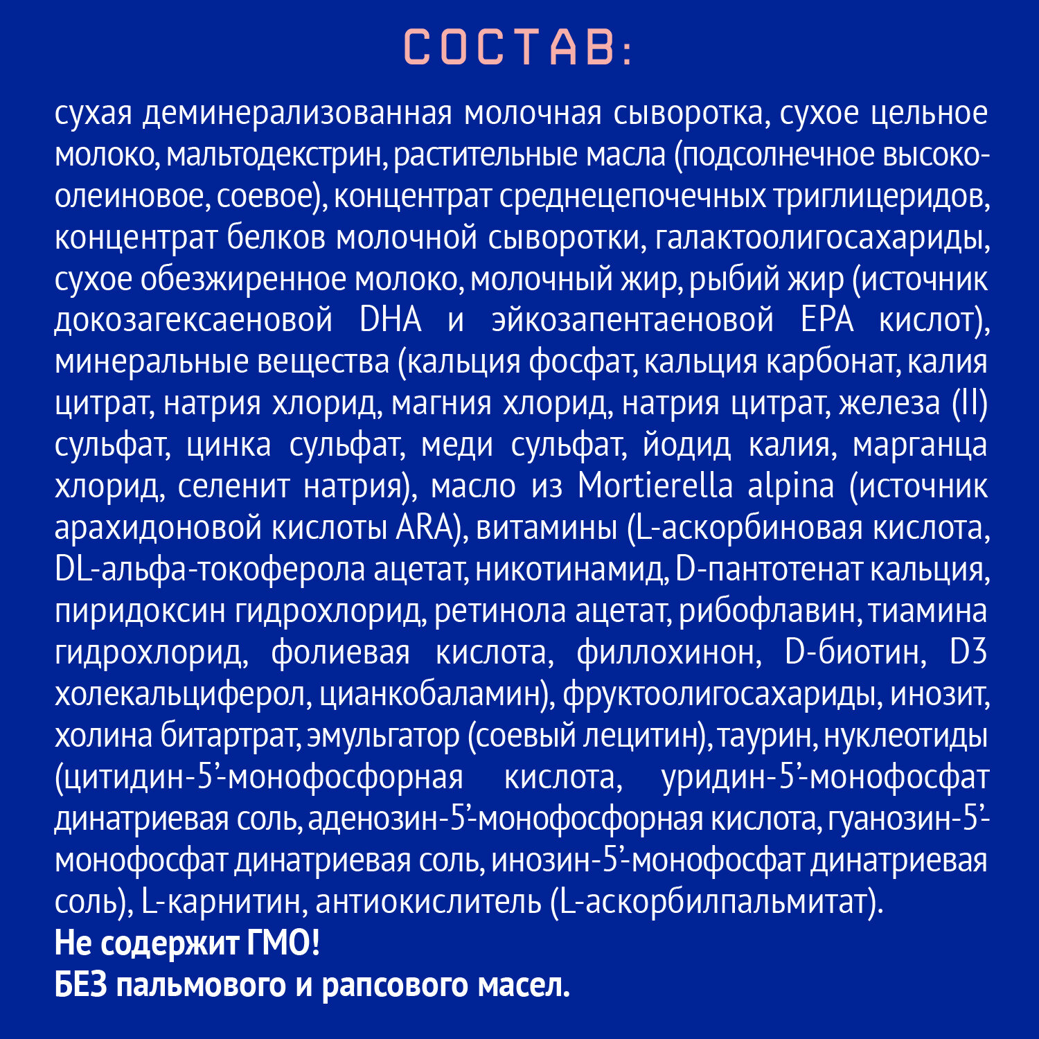 | Состав | Сухая деминерализованная молочная сыворотка, сухое цельное молоко, мальтодекстрин, растительные масла (подсолнечное высокоолеиновое, соевое), концентрат среднецепочечных триглицеридов, концентрат сывороточных белков, галактоолигосахариды, сухое обезжиренное молоко, молочный жир, рыбный жир (источник докозагексаеновой dha и эйкозапентаеновой epa кислот), минеральные вещества (фосфат кальция, карбонат кальция, хлорид калия, цитрат калия, хлорид магния, сульфат железа, сульфат цинка, сульфат меди, йодид калия, хлорид марганца, селенит натрия), масло mortierellaalpina (источник арахидоновой кислоты ara), витамины (аскорбиновая кислота, токоферол ацетат, никотинамид, пантотеновая кислота, пиридоксин гидрохлорид, ретинол ацетат, рибофлавин, тиамин гидрохлорид, фолиевая кислота, филлохинон, d-биотин, холекальциферол, цианокобаламин), фруктоолигосахариды, инозитол, холин битартрат, эмульгатор (лецитин), таурин, нуклеотиды (цитидин 5’-монофосфорная кислота, уридин-5’- монофосфатдинатриевая соль, аденозин -5’-монофосфорная кислота, гуанозин-5’-монофосфат динатриевая соль, инозин-5’-монофосфат динатриевая соль), l-карнитин, антиокислитель (аскорбилпальмитат) |