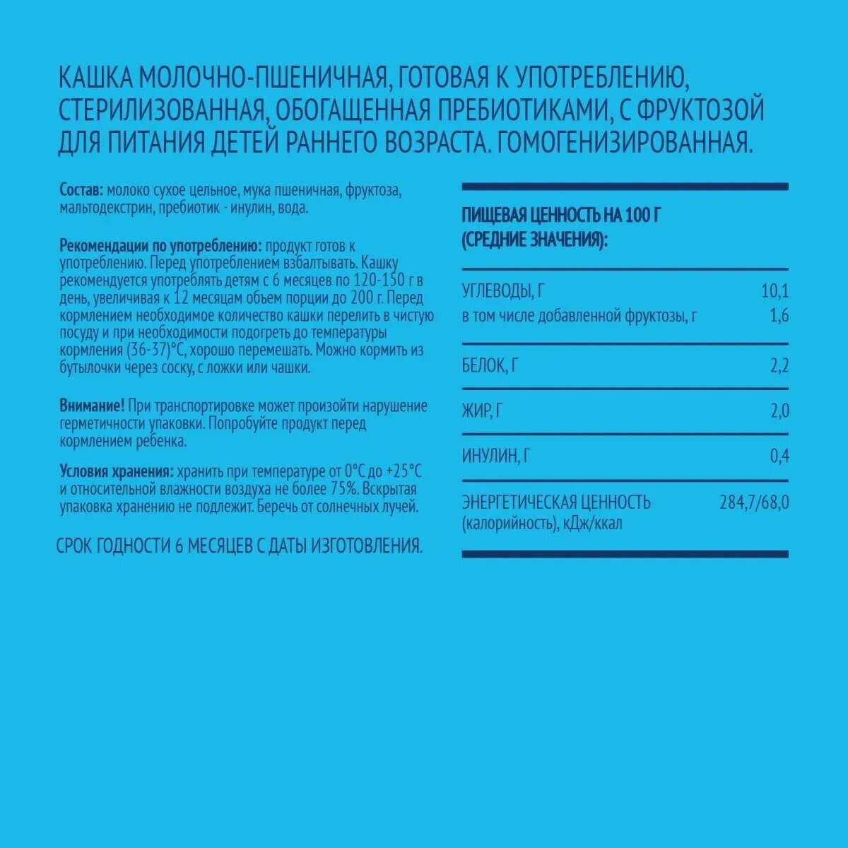 | Способ приготовления | Рекомендуется детям с 6 месяцев по 120-150 г в день, увеличивая к 12 месяцам объем порции до 200 г. Перед кормлением необходимое количество кашки перелить в чистую посуду и при необходимости подогреть до температуры кормления (36-37)°С, хорошо перемешать. Можно кормить из бутылочки через соску, с ложки или из чашки. |
