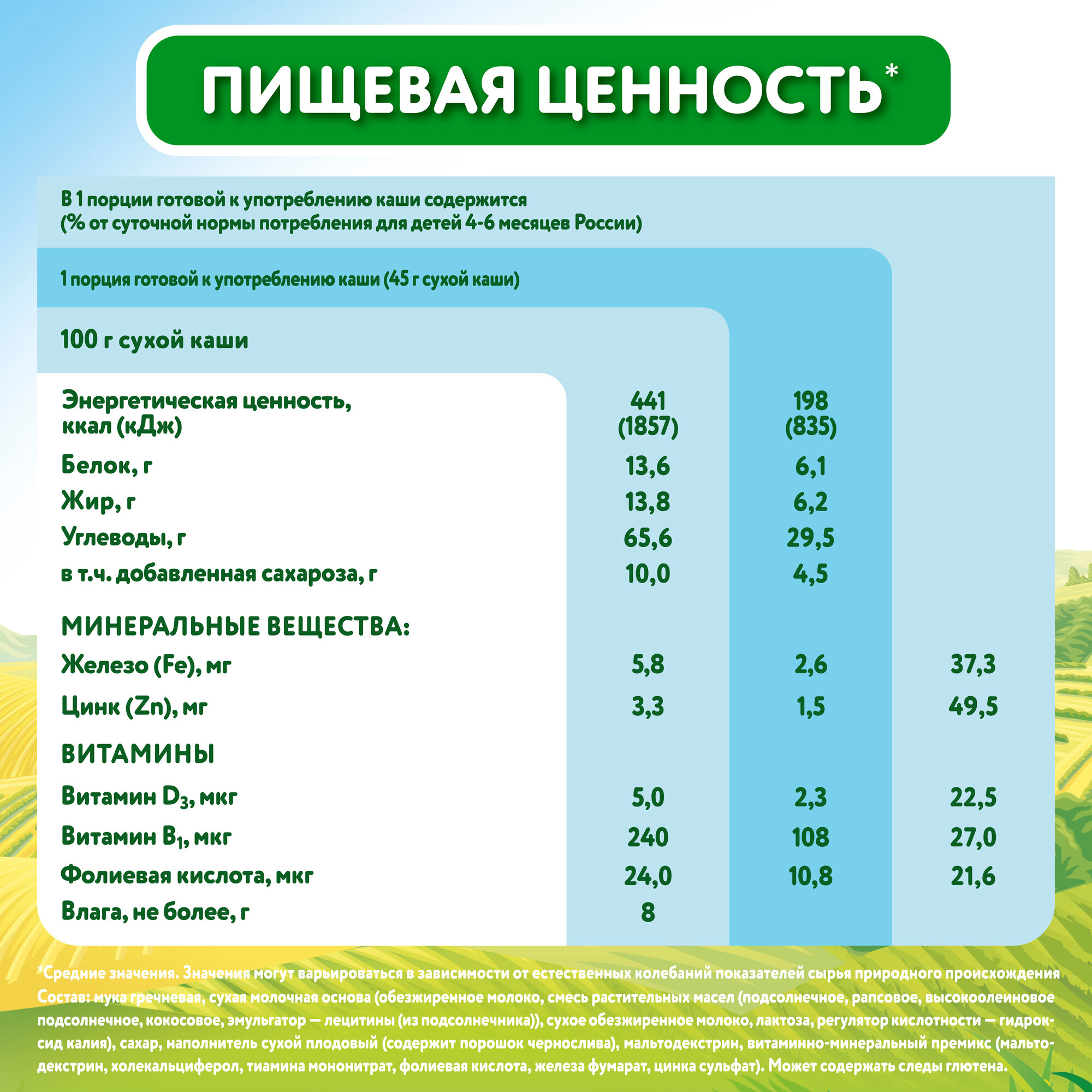 Состав: мука гречневая, сухая молочная основа частично адаптированной смеси (молоко обезжиренное, смесь растительных масел (пальмовое, рапсовое, кокосовое, подсолнечное, соевый лецитин, витамин С, лимонная кислота), сахар, натуральная добавка из чернослива, витаминно-минеральный премикс, мальтодекстрин. Содержит следы глютена.