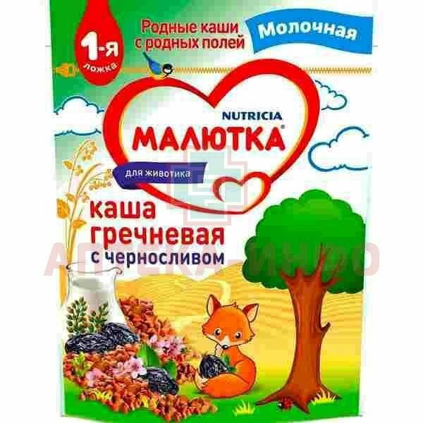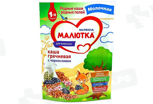 Каша Малютка® гречневая молочная с черносливом для питания детей с 4 месяцев согласно законодательству РФ.