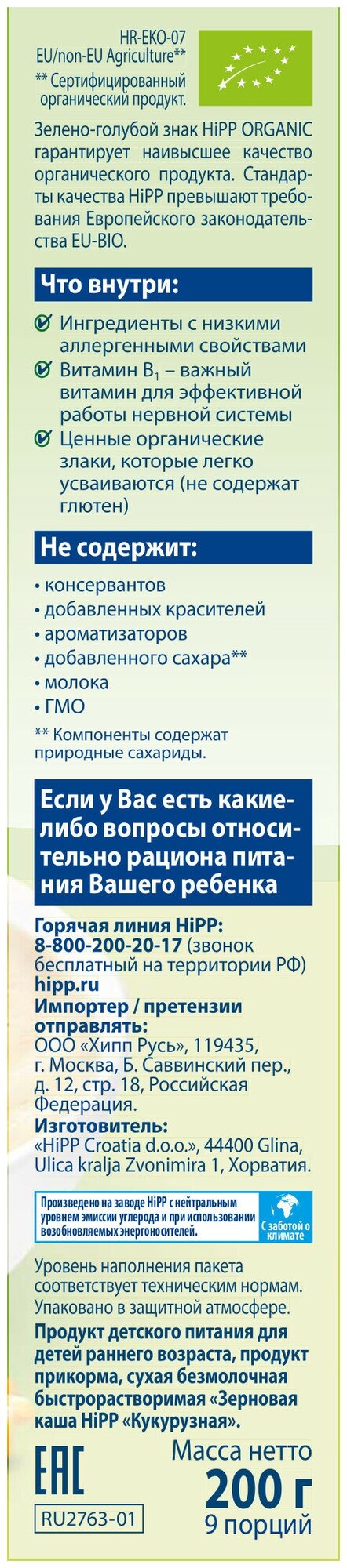 Органическая безмолочная каша HiPP 100% Кукурузная идеально подойдет в качестве первого прикорма для малышей с 5 месяцев. Кукуруза обладает низкоаллергенными свойствами и не содержит глютен. Кукурузная каша обеспечит малыша необходимой энергией и насытит его на длительный период времени.
