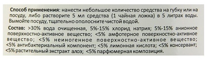 Способ применения: нанести небольшое количество средства на губку или на посуду, либо растворите 5мл. средства (1 чайная ложка) в 5 литрах воды. Вымойте посуду, тщательно ополосните чистой водой.