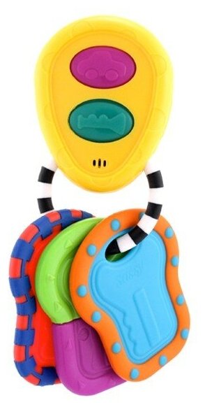 На кольце нанизаны 3 ключа ярких, контрастных цветов и брелок с кнопочками, при нажатии на которые раздаются разнообразные звуки. Почти как у папы, только намного веселее!