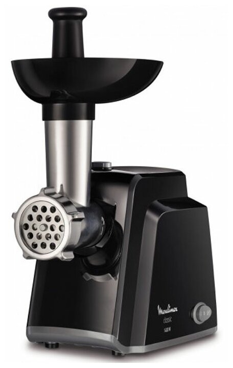 Moulinex – мощная мясорубка, простая в управлении. Особенностью этой модели является высокая мощность, производительность, а также эргономичный и продуманный корпус. При производительности 1.7 кг/мин мясорубка способна перемолоть мясо любой плотности, а благодаря наличию двух решеток с разным диаметром, фарш на выходе будет нужного размера и высокого качества. Качество сборки — высокое. Корпус устройства выполнен из качественных материалов, которые легко вытираются после использования и не подвержены износу, имеет хорошую эргономику и удобные элементы управления.