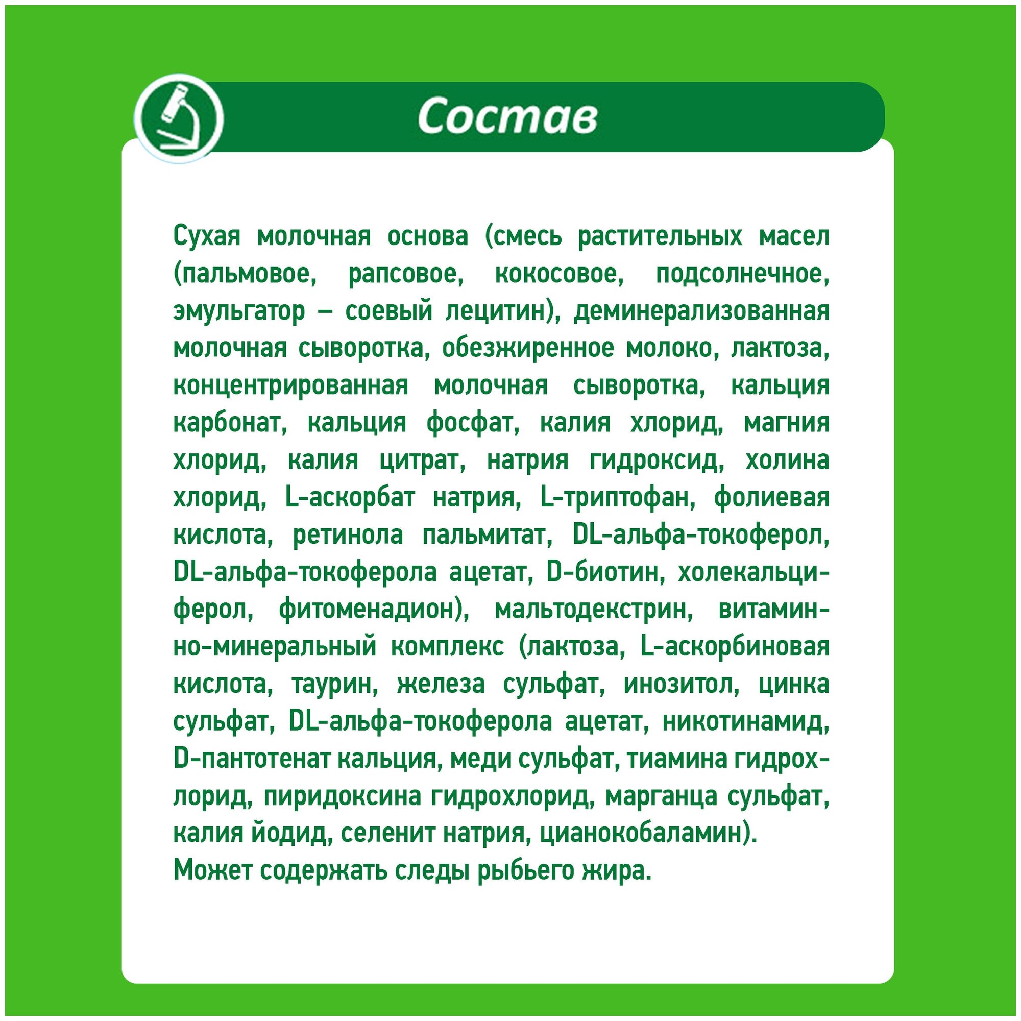 Состав: деминерализованная молочная сыворотка, смесь растительных масел (пальмовое, рапсовое, кокосовое, подсолнечное), мальтодекстрин, лактоза, молоко обезжиренное, концентрат белков молочной сыворотки, минеральные вещества, витаминный комплекс, холин, таурин, соевый лецитин, микроэлементы, инозит, L-триптофан.