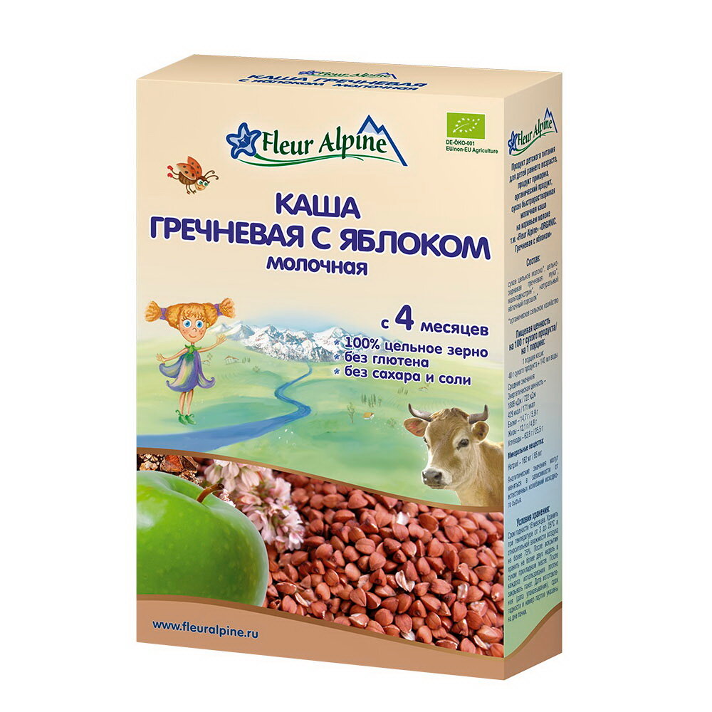 Каша молочная Fleur Alpine Гречневая с яблоком для детей старше 4 месяцев. Без глютена. Без добавленного сахара. Изготовлена из высококачественного цельного зерна, предназначенного для питания детей. Разводится легко, быстро и без комочков.