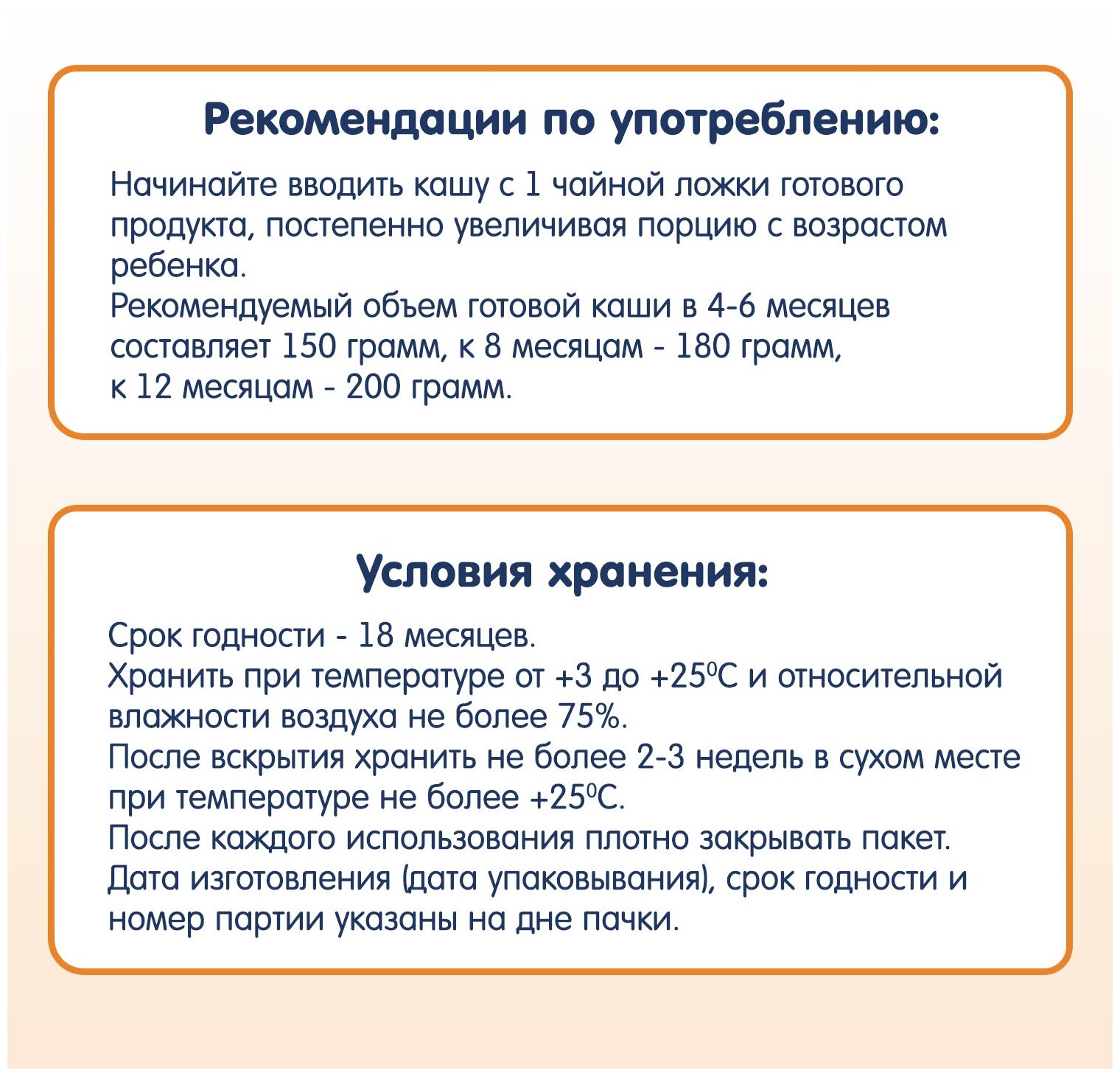 Начинайте вводить кашу с 1 чайной ложки готового продукта, постепенно увеличивая порцию с возрастом ребенка. Рекомендуемый объем готовой каши в 4-6 месяцев составляет 150 г, к 8 месяцам - 180 г, к 12 месяцам – 200 г. Не используйте остатки каши для последующего кормления.