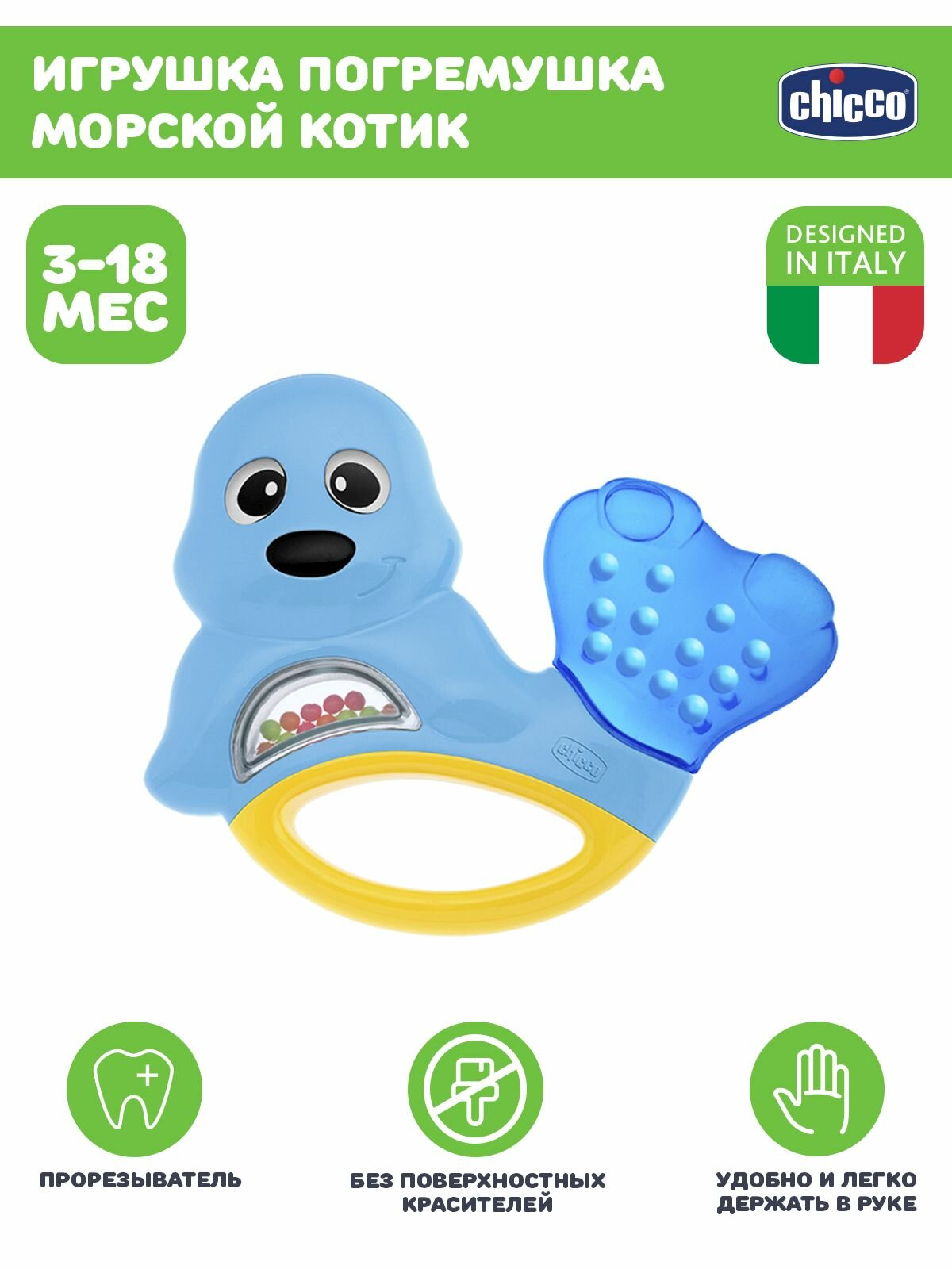 Яркая развивающая игрушка-погремушка Chicco "Морской котик" привлечет внимание вашего малыша и не позволит ему скучать. Она выполнена из безопасного пластика в виде забавного морского котика. Внутри игрушки под прозрачным окошком находятся маленькие разноцветные шарики, которые перекатываются и гремят при тряске. Хвостик, наполненный охлаждающей жидкостью, послужит малышу в качестве прорезывателя, который поможет снять неприятные ощущения при появлении зубов. В нижней части игрушки находится удобная ручка, за которую малыш сможет ее держать. Форма игрушки удобна для маленьких детских ручек. Ребенок сможет ее держать, трясти и перекладывать из одной ручки в другую. Игрушка-погремушка Chicco "Морской котик" поможет ребенку в развитии цветового и звукового восприятия, мелкой моторики рук, координации движений и тактильных ощущений.
