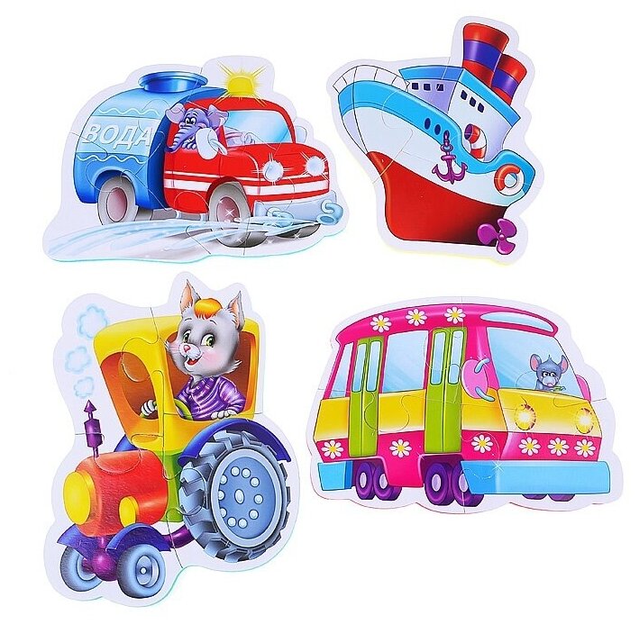 В комплект входят 4 картинки: Автобус, Трактор, Катер и Водовоз.