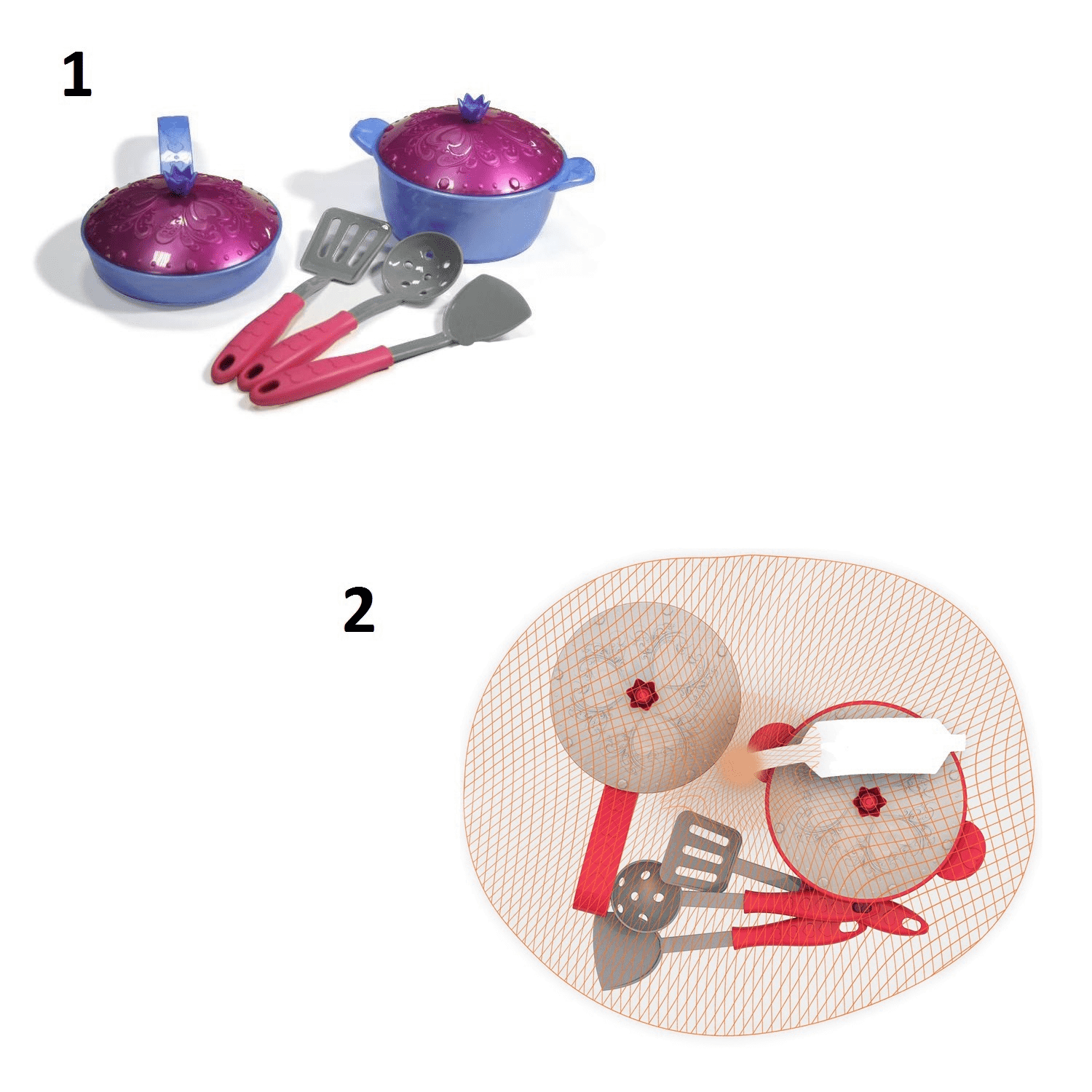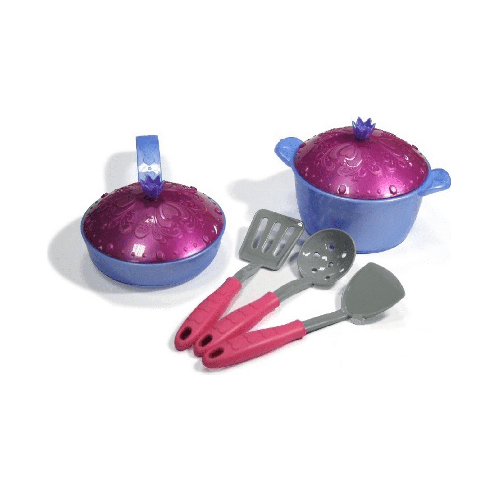 - В комплекте 7 предметов: сковородка. кастрюлька, кухонная утварь.