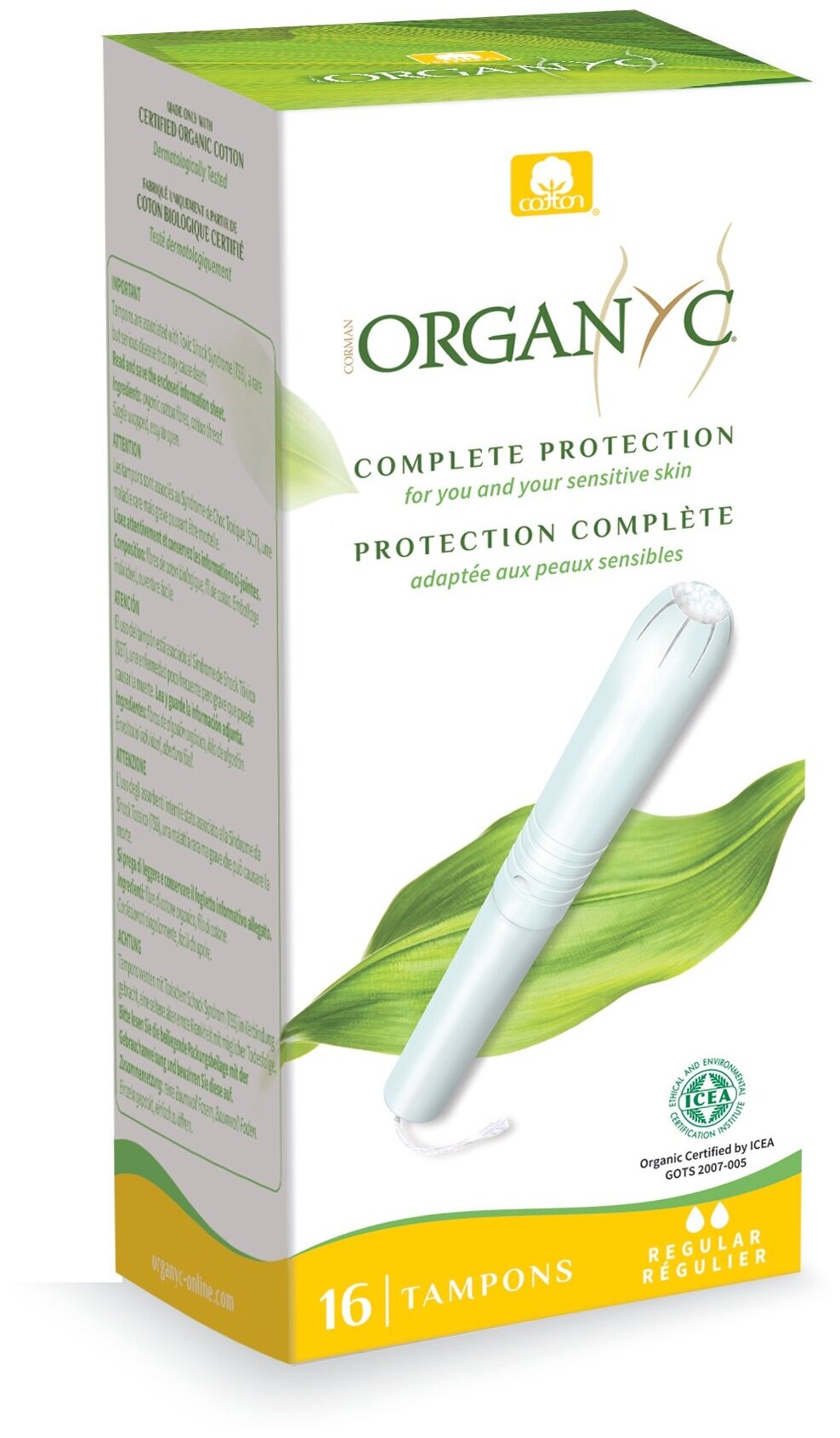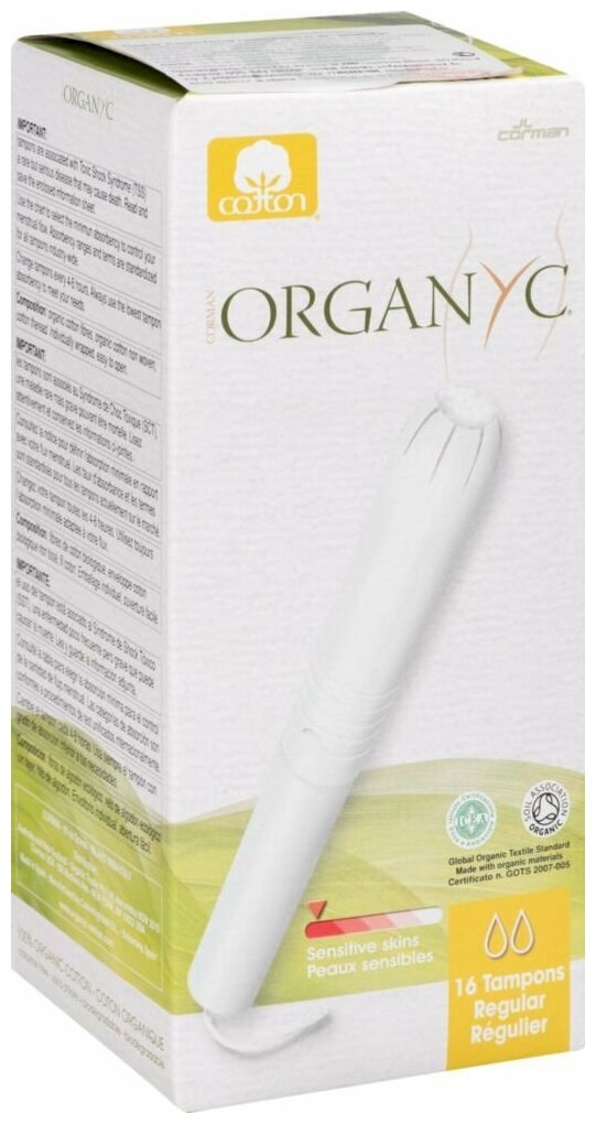 Тампоны (2 капли) Регулар с аппликатором. Продукция Organyc идеально подходит тем женщинам, которые хотят избежать любого контакта кожи с синтетическими материалами, которым важно чувствовать свежесть, безопасность и чистоту в критические дни. Гипоаллергенны. Без отдушек. Не содержат нефтехимических супер-адсорбентов. Вы почувствуете преимущества продукции Organyc в первый же месяц использования. Отбелено без хлора. Биоразлагаемы.