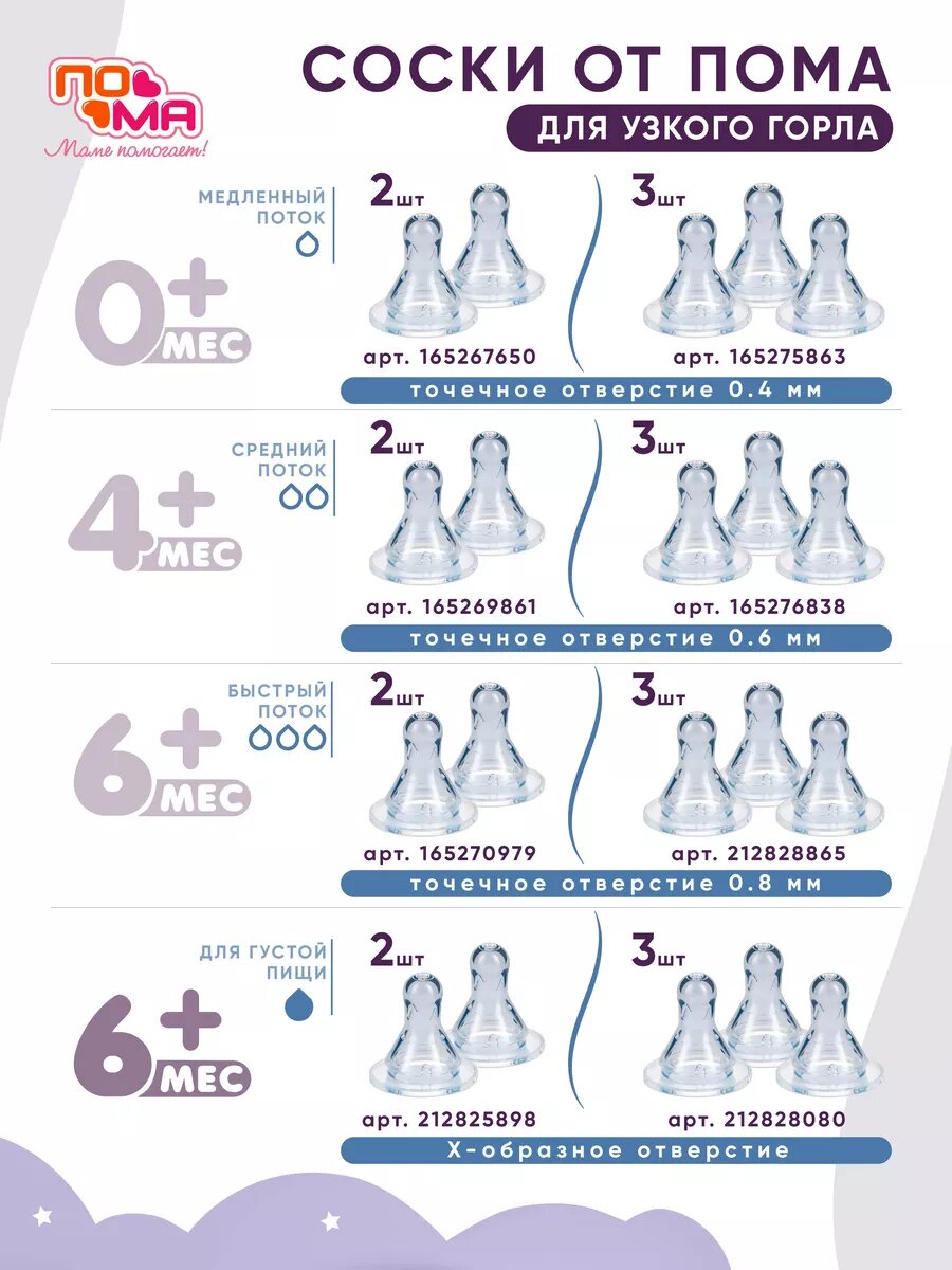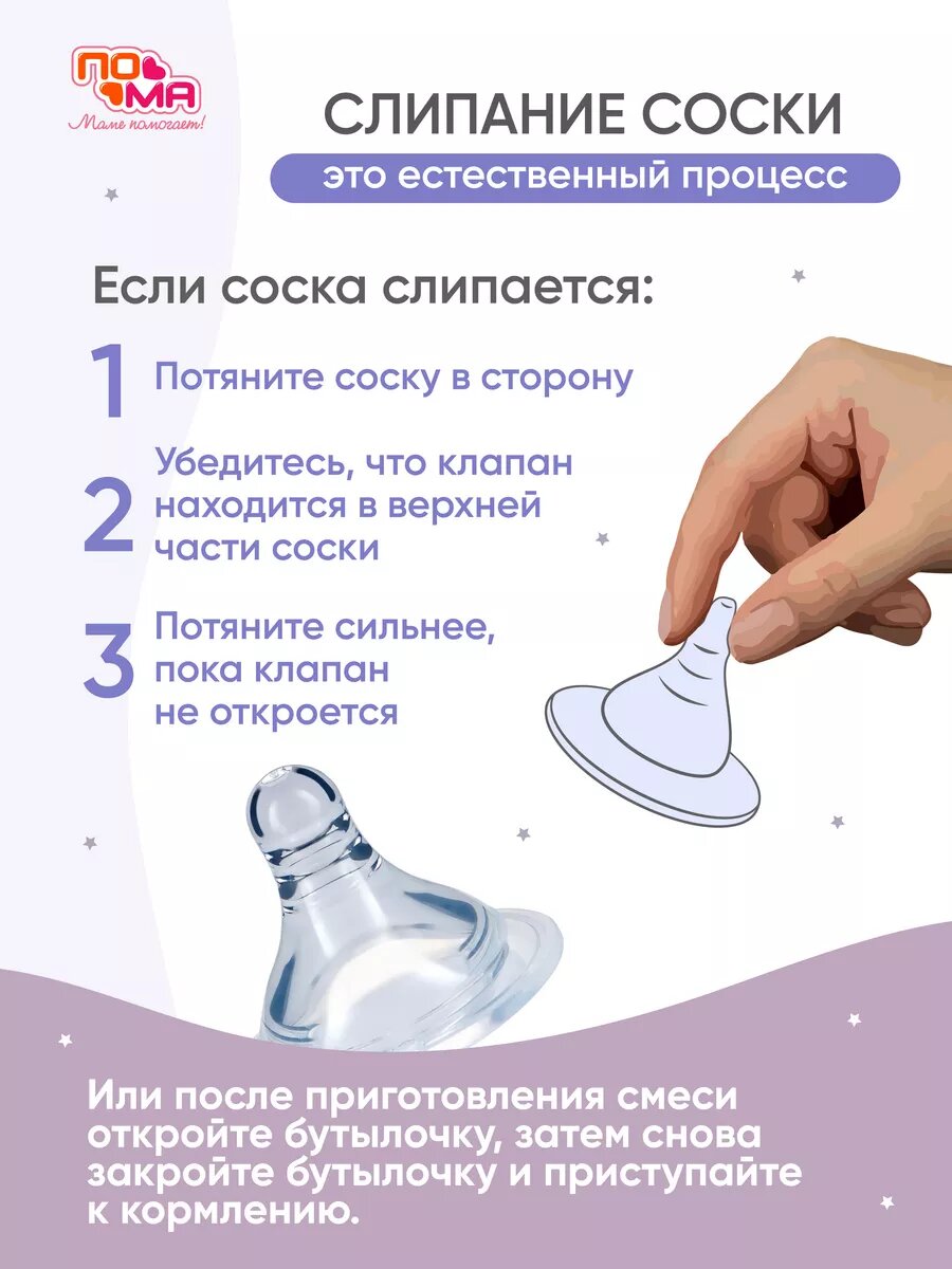 Соска силиконовая адаптированная для бутылочек с широким горлом (средний поток 4+). Соска подходит к бутылочкам ТМ "ПоМа" с широким горлом. Мягкая силиконовая форма соски имитирует мамину грудь, тем самым позволяя мамочке сохранять грудное вскармливание.