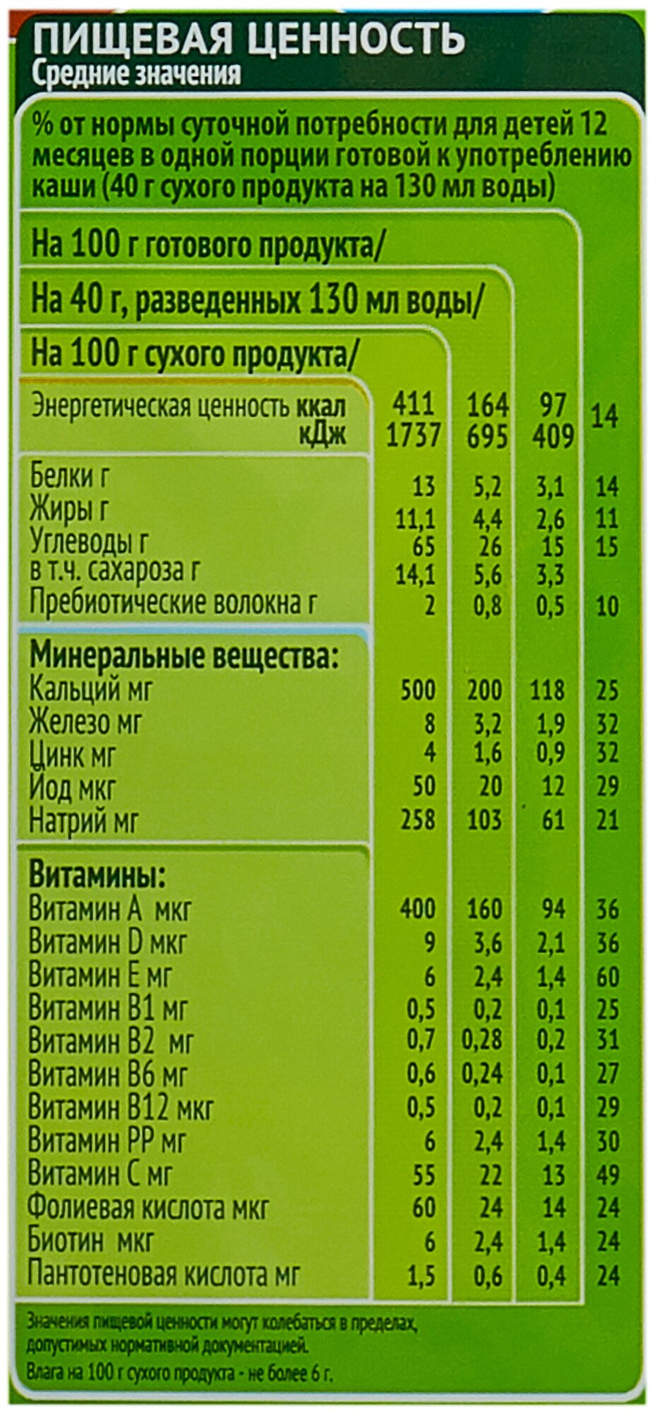 | Состав | пшеничная (19%) и гречневая (6%) мука, продукт экструдированный гречневый (гречневая крупа, сахар) (17%), сахар (14%), сухое цельное молоко (12%), сухие сливки, сухое обезжиренное молоко, яблочный сок концентрированный (5%), волокна цикория пребиотические (инулин), кукурузное масло, кусочки малины (сухие) (2%), хлопья чёрной смородины (0.4%), соль (0,36%), витамины и минеральные вещества |