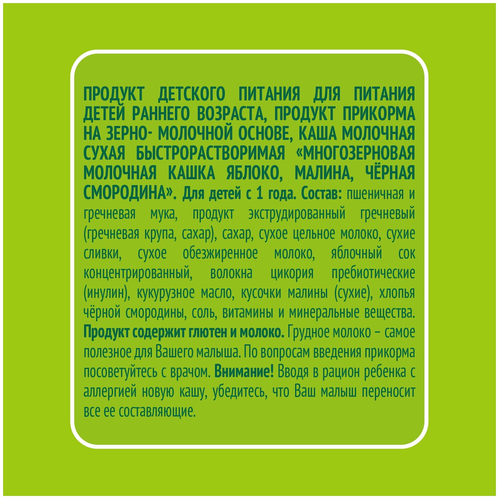 - Состав: Гречневая и пшеничная мука, продукт экструдированный гречневый (гречневая крупа, сахар, соль), сухое обезжиренное молоко, сахар, сухое цельное молоко, кукурузное масло, яблоко, малина, карбонат кальция, лактат кальция, чёрная смородина, соль, железо, окись цинка, йодистый калий, витамины: А, D, Е, В1, В2, В6, В12, РР, С, фолиевая кислота, биотин, пантотеновая кислота.