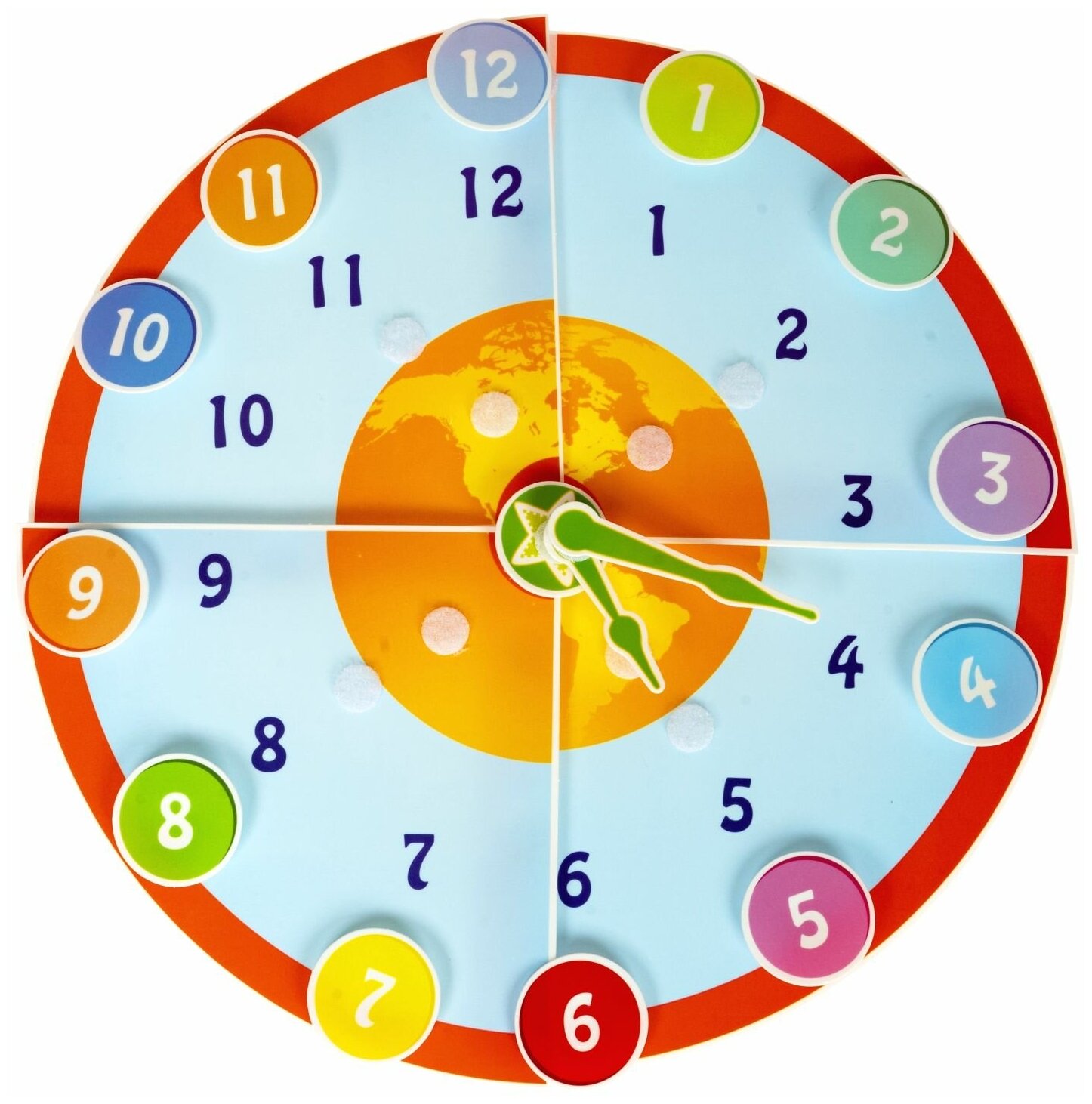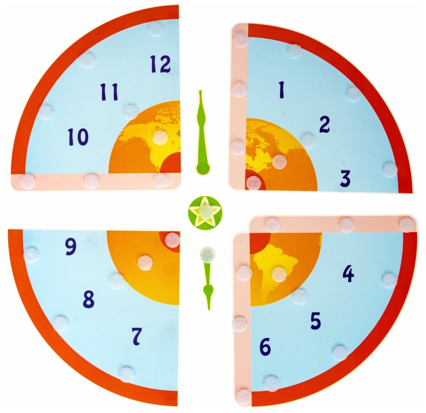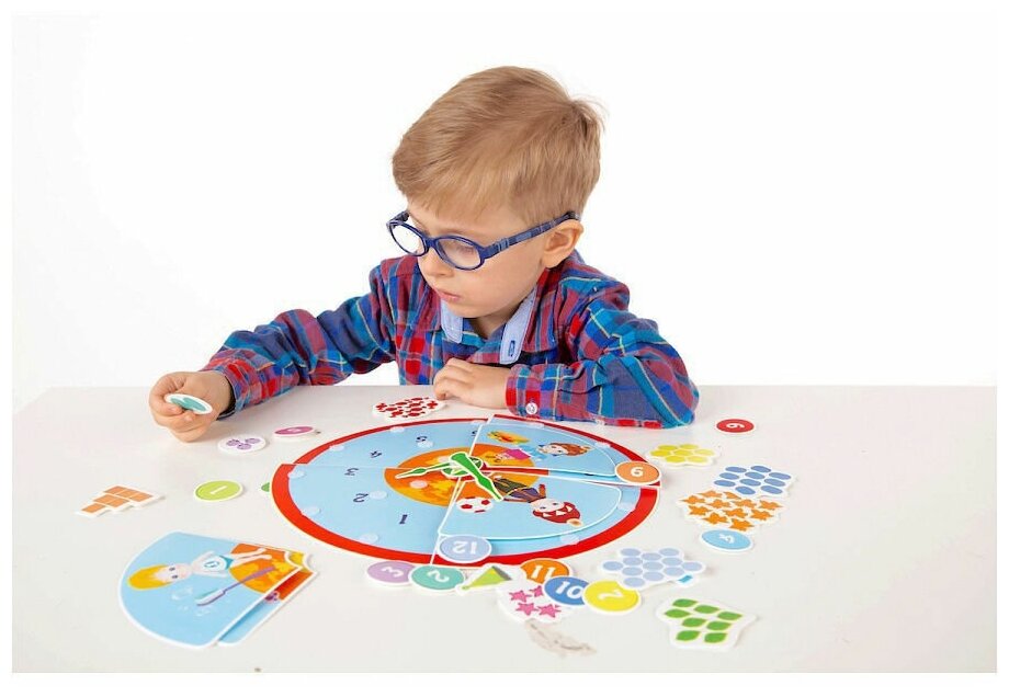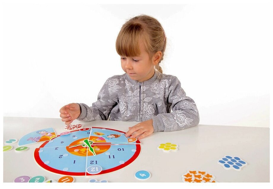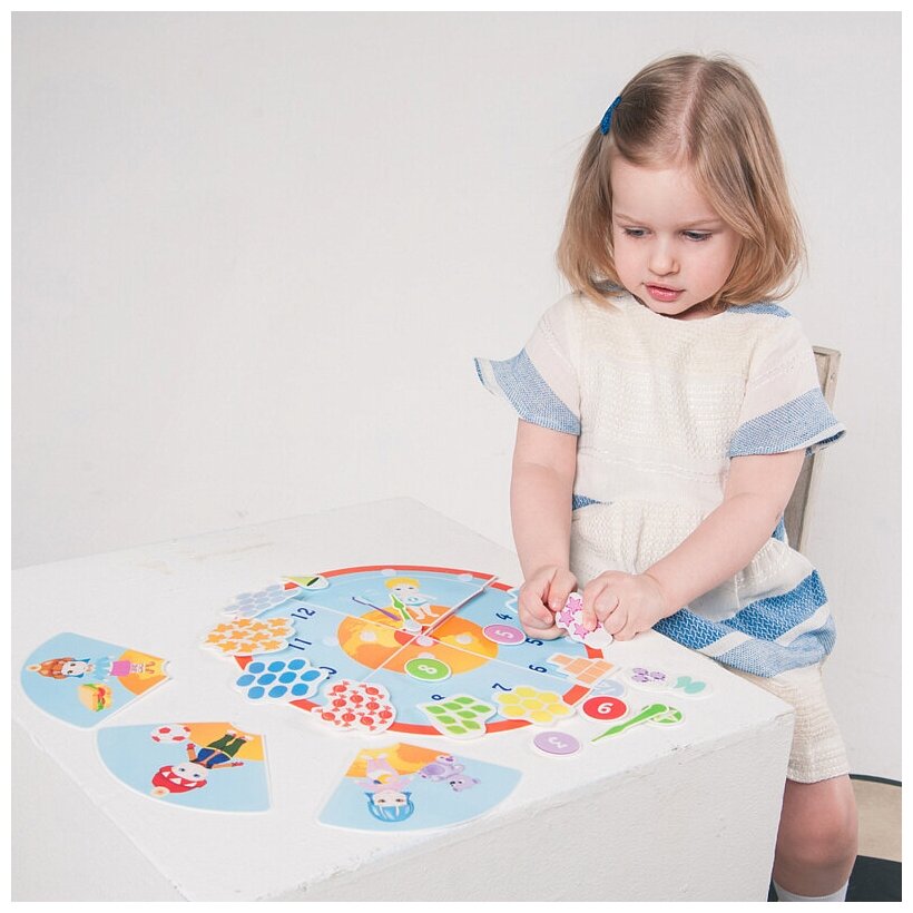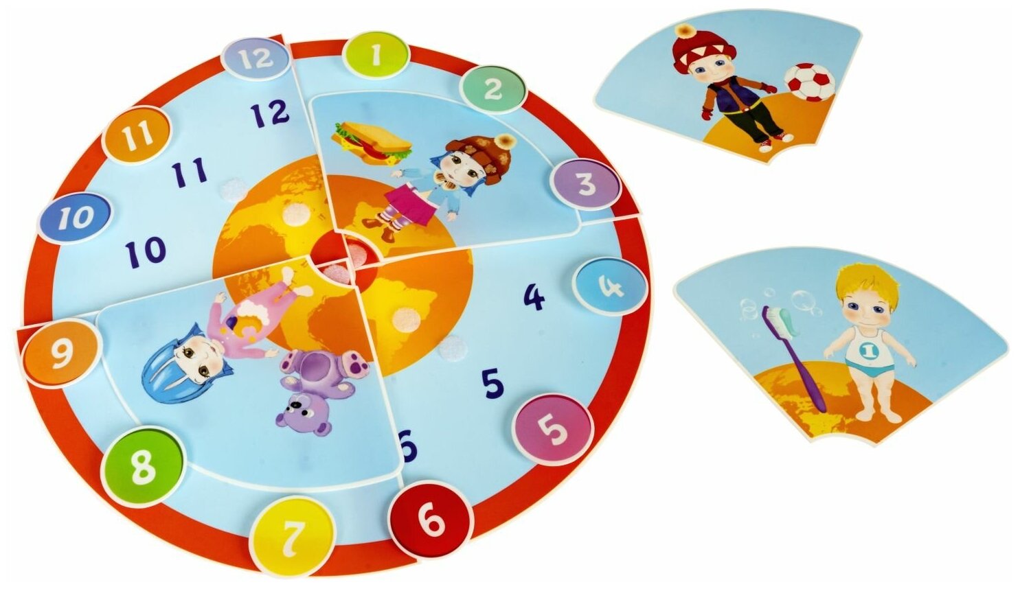 Обучающая игра пазл-липучка состоит из 4 игровых полей, заполняя которые, ребенок изучает значение цифр, показатели времени, также учится понимать, из каких частей состоит день.