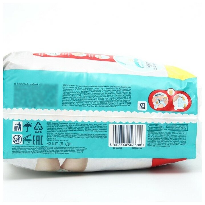 Подгузники-трусики Pampers Pants предназначены для малышей весом 12-17 кг. Иногда подгузник на липучках может вызывать дискомфорт у малыша - прилегая туго или наоброт, слишком свободно, вызывая протекания. Есть выход! Трусики Pampers с удобной посадкой 360 и эластичным пояском комфортно прилегают к животику и ножкам, защищая от протеканий на всю ночь. Трусики Pampers легко надевать и снимать, не вызывая дискомфорт у малыша, даже если он очень подвижен.