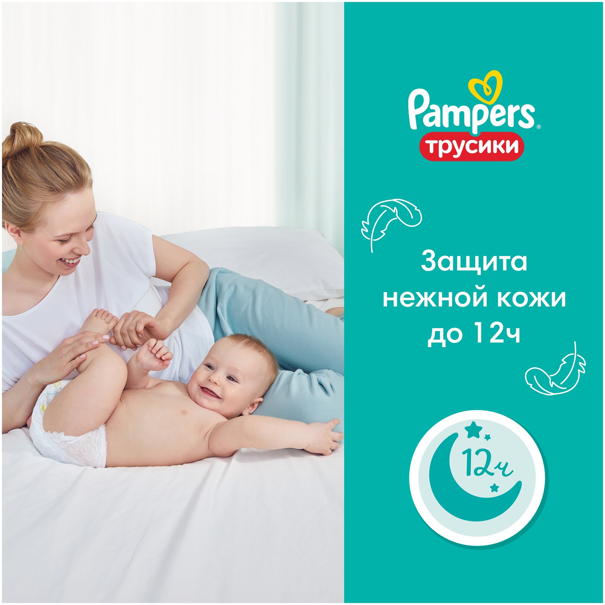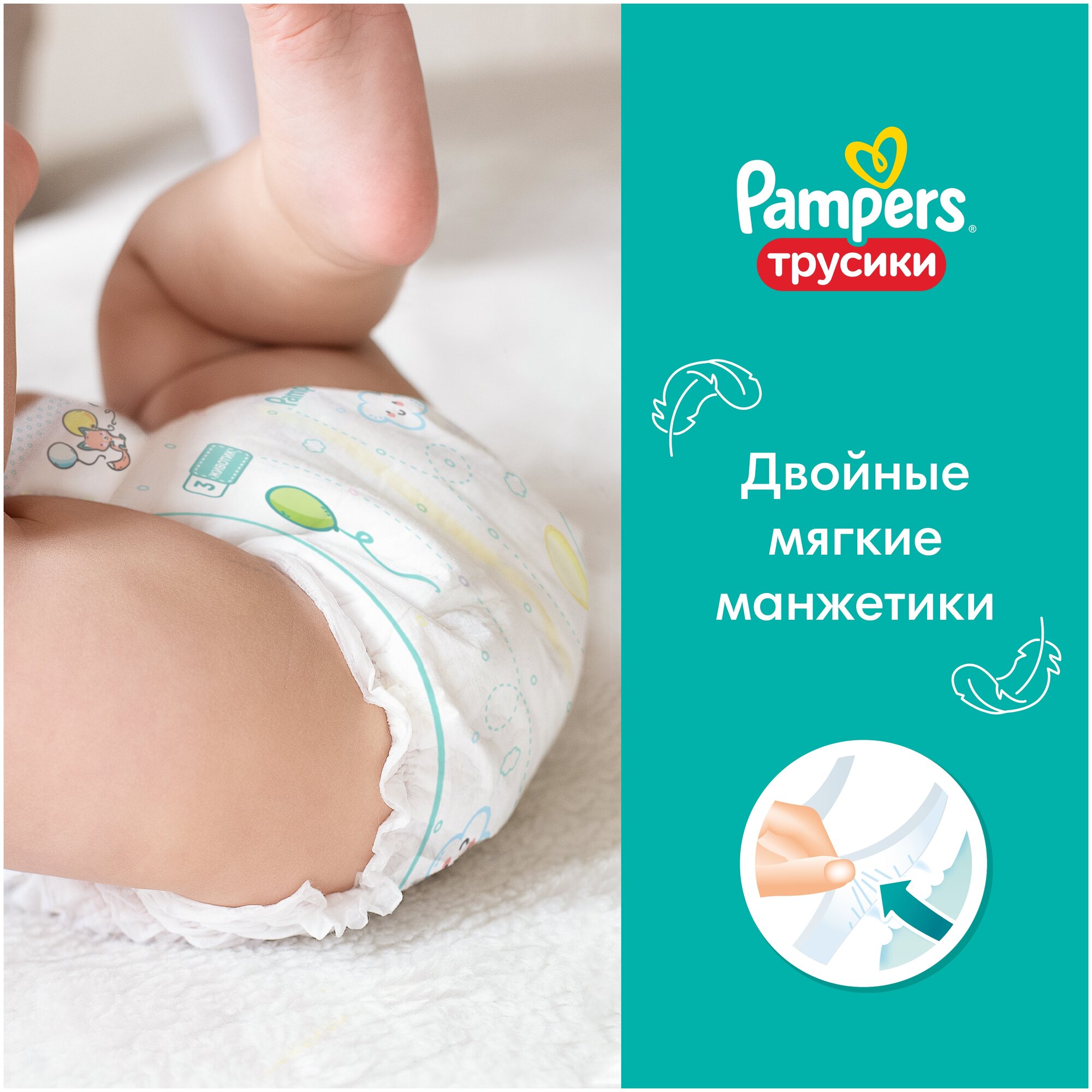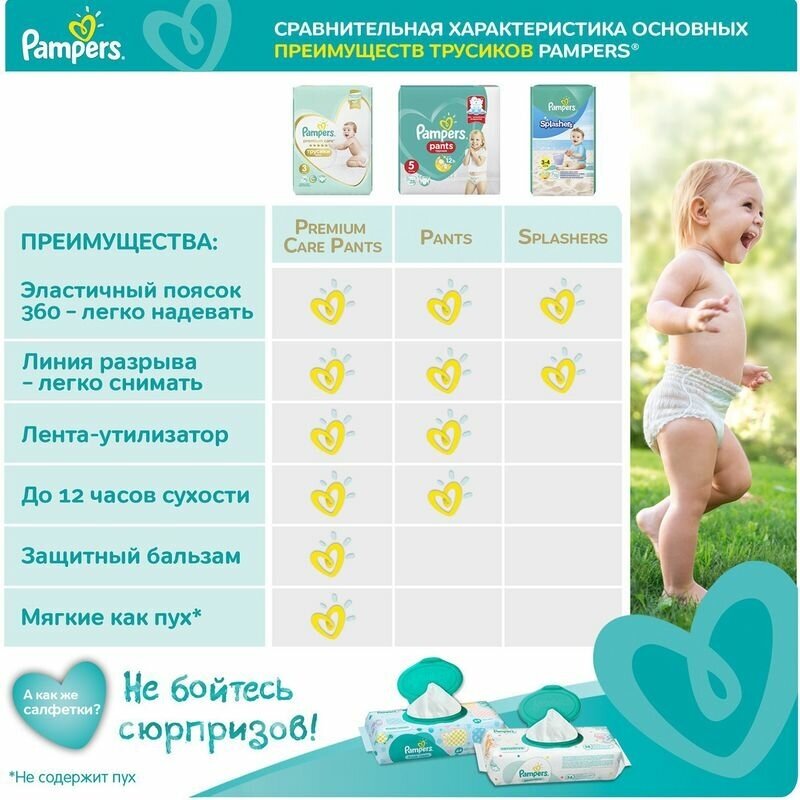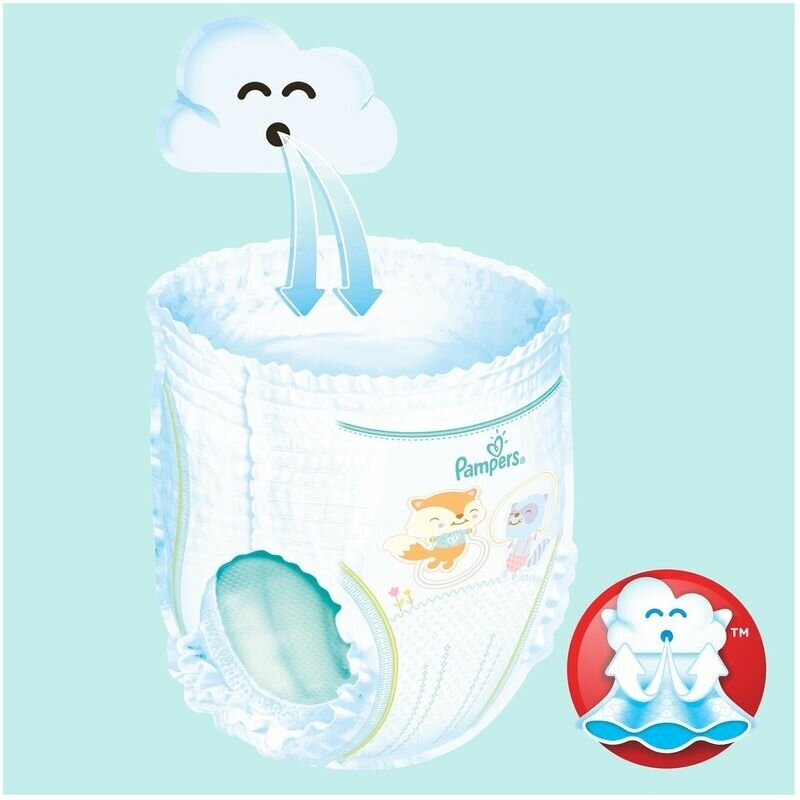 Подгузники-трусики Pampers Pants предназначены для малышей весом 9-15 кг. Иногда подгузник на липучках может вызывать дискомфорт у малыша - прилегая туго или наоброт, слишком свободно, вызывая протекания. Есть выход! Трусики Pampers с удобной посадкой 360 и эластичным пояском комфортно прилегают к животику и ножкам, защищая от протеканий на всю ночь. Трусики Pampers легко надевать и снимать, не вызывая дискомфорт у малыша, даже если он очень подвижен.
