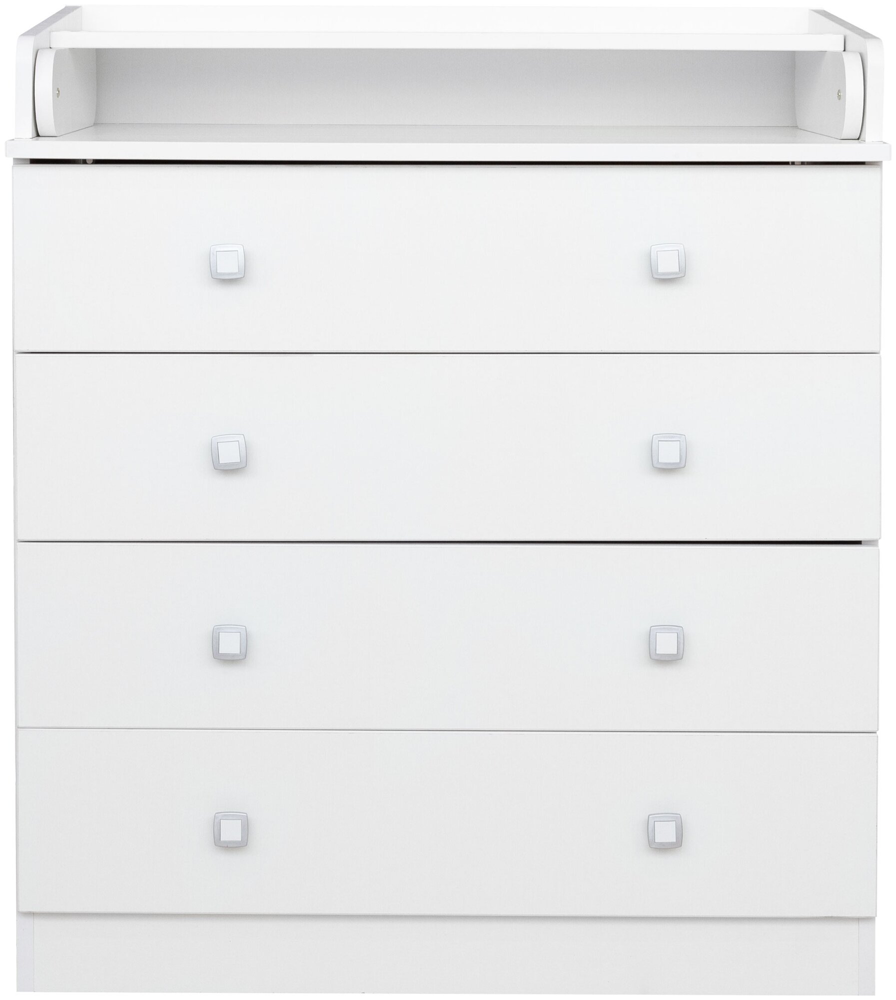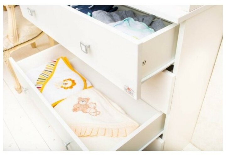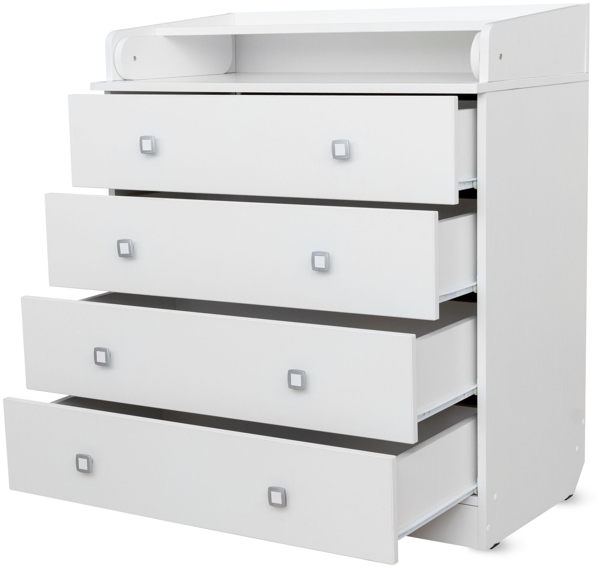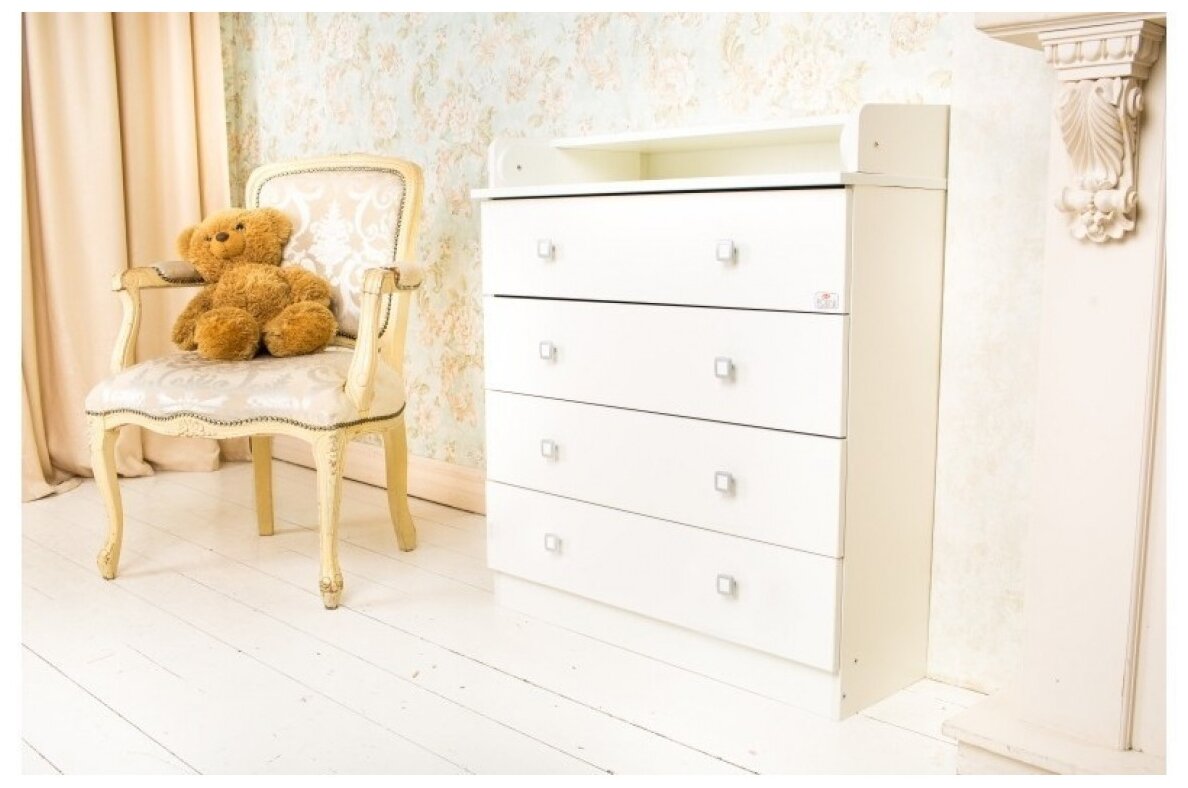 Комод имеет четыре вместительных ящика на роликовых направляющих и откидной столик для пеленания малыша.