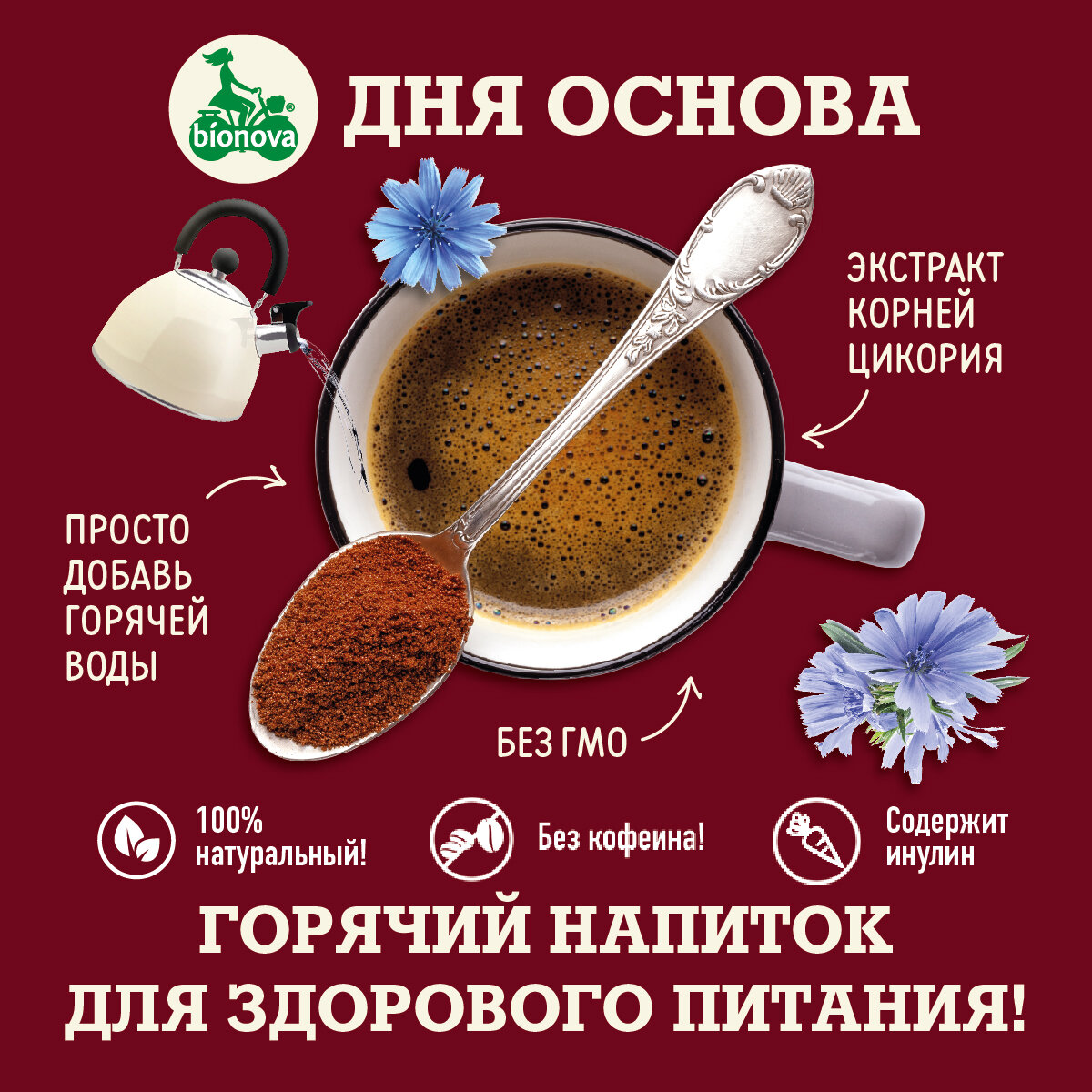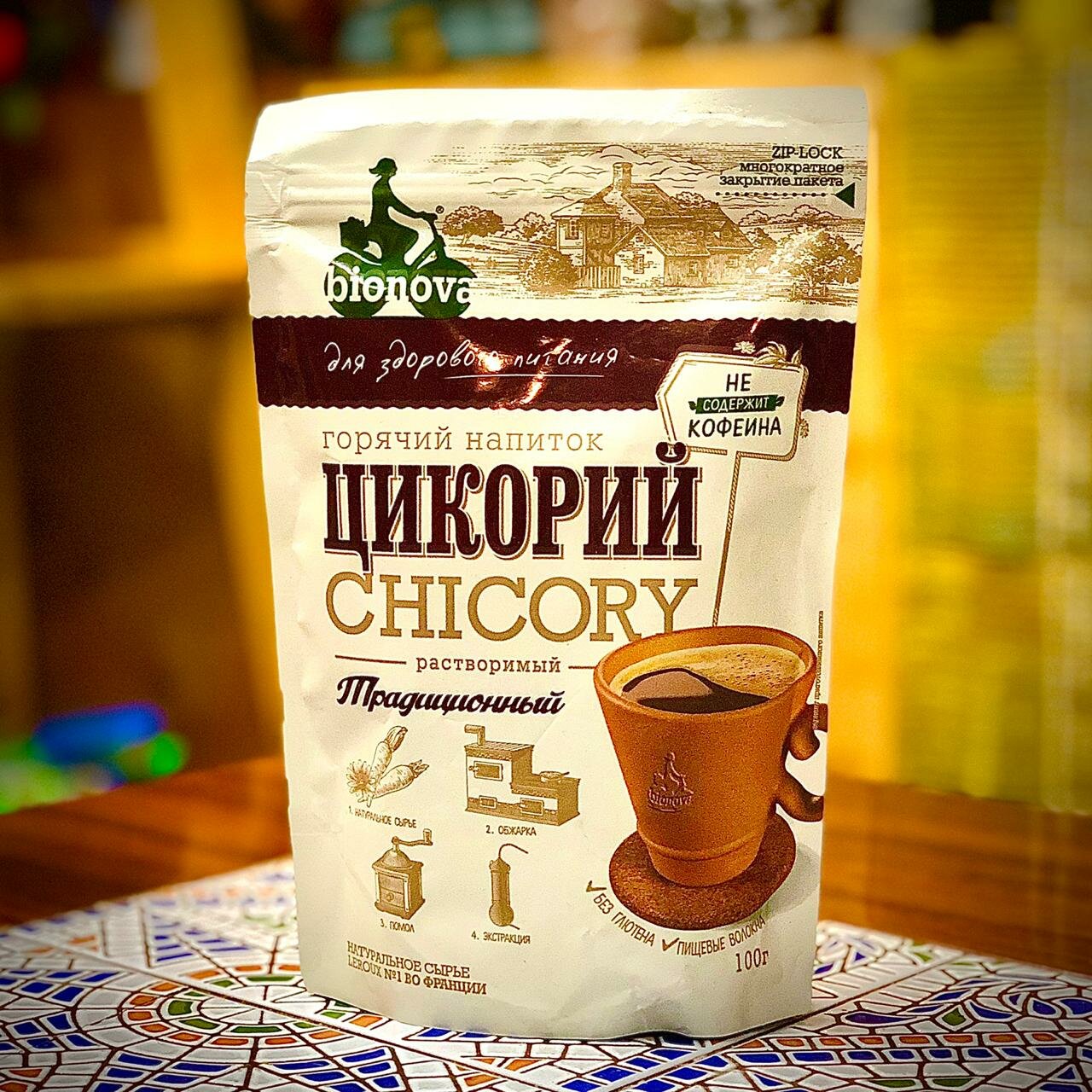 Горячий напиток для здорового питания, изготовленный из корней цикория, выращенных и обработанных по уникальной технологии производства компании LEROUX S.A.S (Франция)