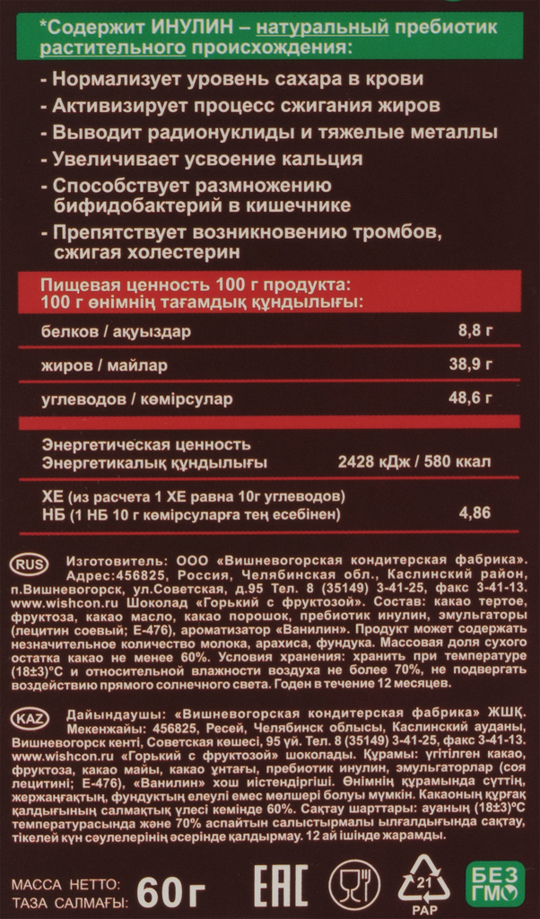 | Состав | Какао тертое, фруктоза, какао масла, какао порошок, пребиотик инулин, эмульгатор E-322, E-476, ароматизатор "Ванилин". Массовая доля сухого остатка какао не менее 60%. |