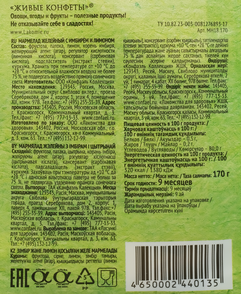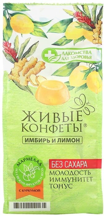 | Состав | Фруктоза, патока, лимон, корень имбиря, желирующий агент (агар), регулятор кислотности (лимонная кислота), консервант (сорбиновая кислота). |