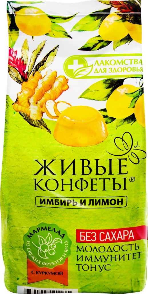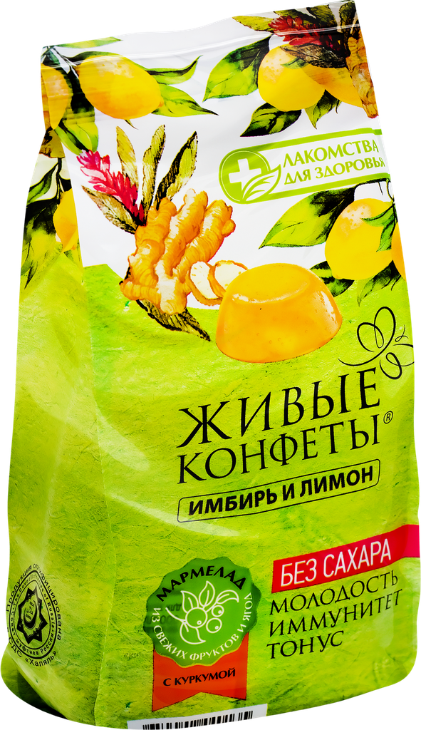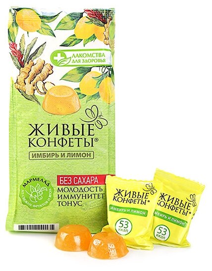 Состав: лимон, корень имбиря, фруктоза, патока, лимонная кислота, желирующие компоненты - вытяжки из морских водорослей, сорбиновая кислота.