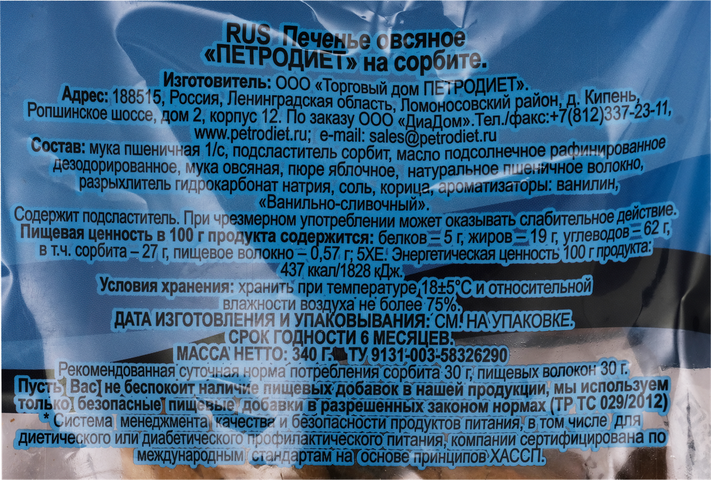 Печенье Петродиет овсяное на сорбите 340 г (5101)