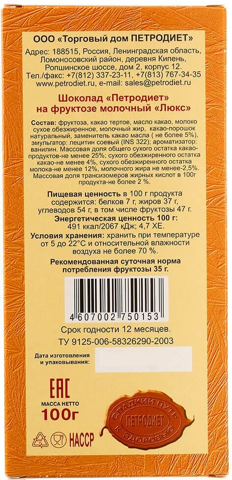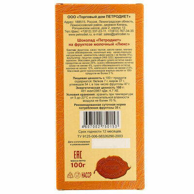 Шоколад Петродиет Люкс на фруктозе молочный 100 г (3709)