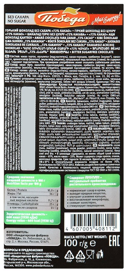 Шоколад Победа вкуса горький б/сахара 72% какао 100 г (3703)