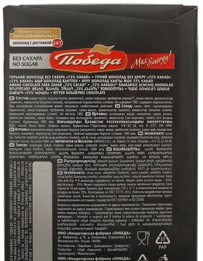 Сервис сравнения цен СкидкаГИД предлагает сравнить цены на товар «Шоколад Победа вкуса горький б/сахара 72% какао 100 г (3703)»