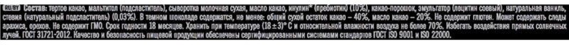 | Состав | какао-масло, какао тертое, сухое обезжиренное молоко, сыворотка молочная сухая, подсластитель (мальтитол), пребиотик (инулин), молоко цельное сухое, эмульгатор (лецитин соевый), ароматизатор (ванилин), натуральный подсластитель (стевия), ароматизатор (ванилин). |