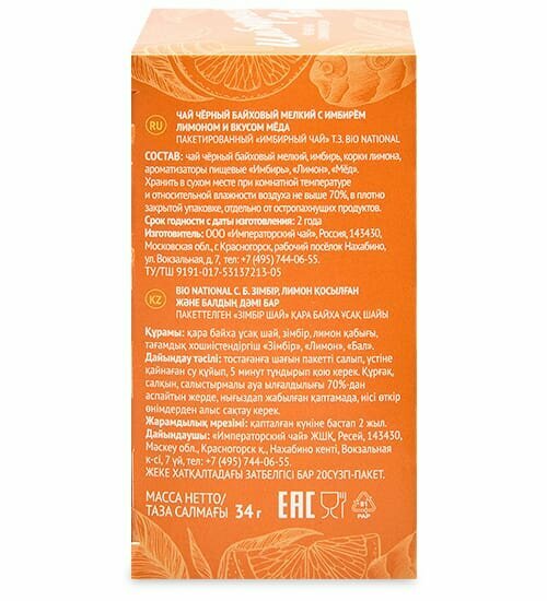 Состав: чай чёрный байховый мелкий высший сорт, имбирь, корки лимона, ароматизатор пищевой Имбирь, Лимон, Мёд.