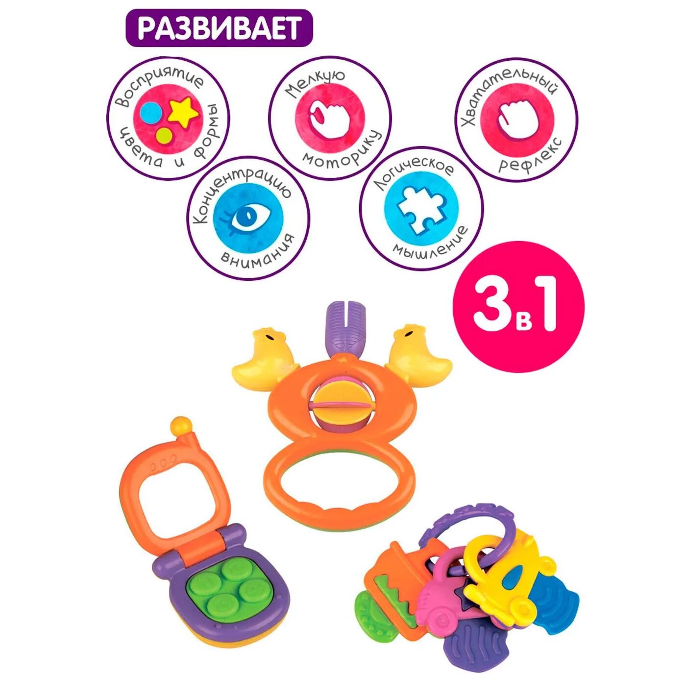 Эти яркие, звонкие, приятные на ощупь погремушки в форме мобильного телефона, прорезыватель и погремушка станут любимыми игрушками Вашей крохи с первых дней жизни. Они развивают мелкую моторику, восприятие формы и цвета предметов, а также слух и зрение.
