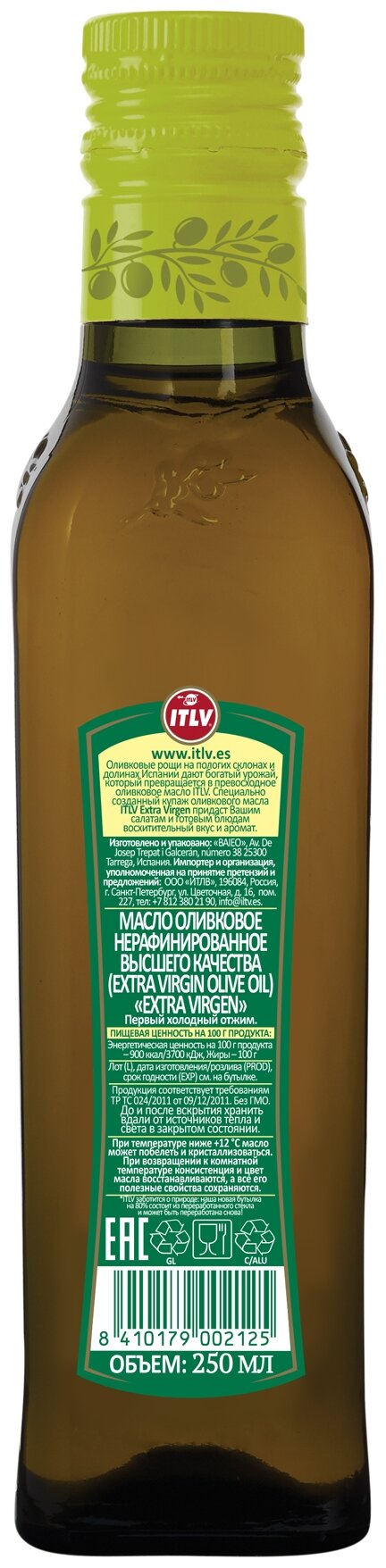 Extra Virgen ITLV - это нерафинированное оливковое масло первого холодного отжима. Масло Extra Virgen считается одним из лучших сортов оливкового масла. Оно имеет насыщенный цвет, меняющий свой оттенок от янтарного до зеленоватого. Характерной вкусовой особенностью этого масла является приятный горьковатый вкус, обусловленный вкусовыми свойствами свежих оливок, из которых оно вырабатывается.