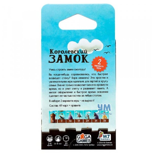 Игра для детей от 6 лет с милыми картинками и логическим содержанием. Каждый игрок выступает в роли строителя замка, и должен первым закончить свою стену (ряд карт). В свой ход игроки открывают лежащие взакрытую на столе карты и либо добавляют их к своей стене, либо сбрасывают обратно. Сложность заключается в том, что карты в ряду игроков должны располагаться строго по возрастанию. Тот, кто первым соберёт 10 карт, считается победителем. Некоторые карты (пушка, королева, волшебник, принц и принцесса ) обладают специальными способностями и приносят дополнительные очки.