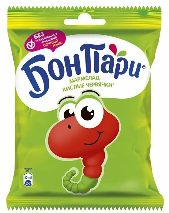 Жевательный мармелад со вкусом фруктов в виде червячка, обсыпной. Без искусственных красителей и ароматизаторов. С фруктовым соком и витамином С..Для изготовления мармелада БОН ПАРИ® используются только природные красители, полученные из натуральных компонентов, таких как морковь, перец, шпинат С фруктовым соком и витамином С.
