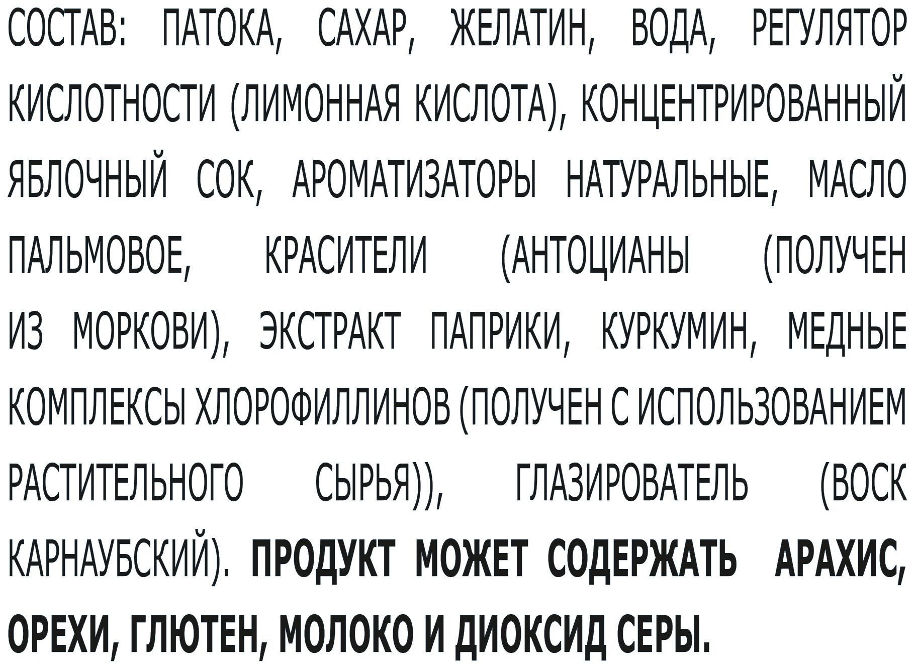 | Состав | Патока, сахар, желатин, вода, регулятор кислотности (лимонная кислота), концентрированный яблочный сок, ароматизаторы натуральные, масло пальмовое, красители (антоцианы (получен из моркови), экстракт паприки, куркумин, медные комплексы хлорофиллинов (получен с использованием растительного сырья)), глазирователь (воск карнаубский).Продукт может содержать арахис, орехи, глютен, молоко и диоксид серы. Продукт может содержать арахис, орехи, глютен, молоко и диоксид серы. |