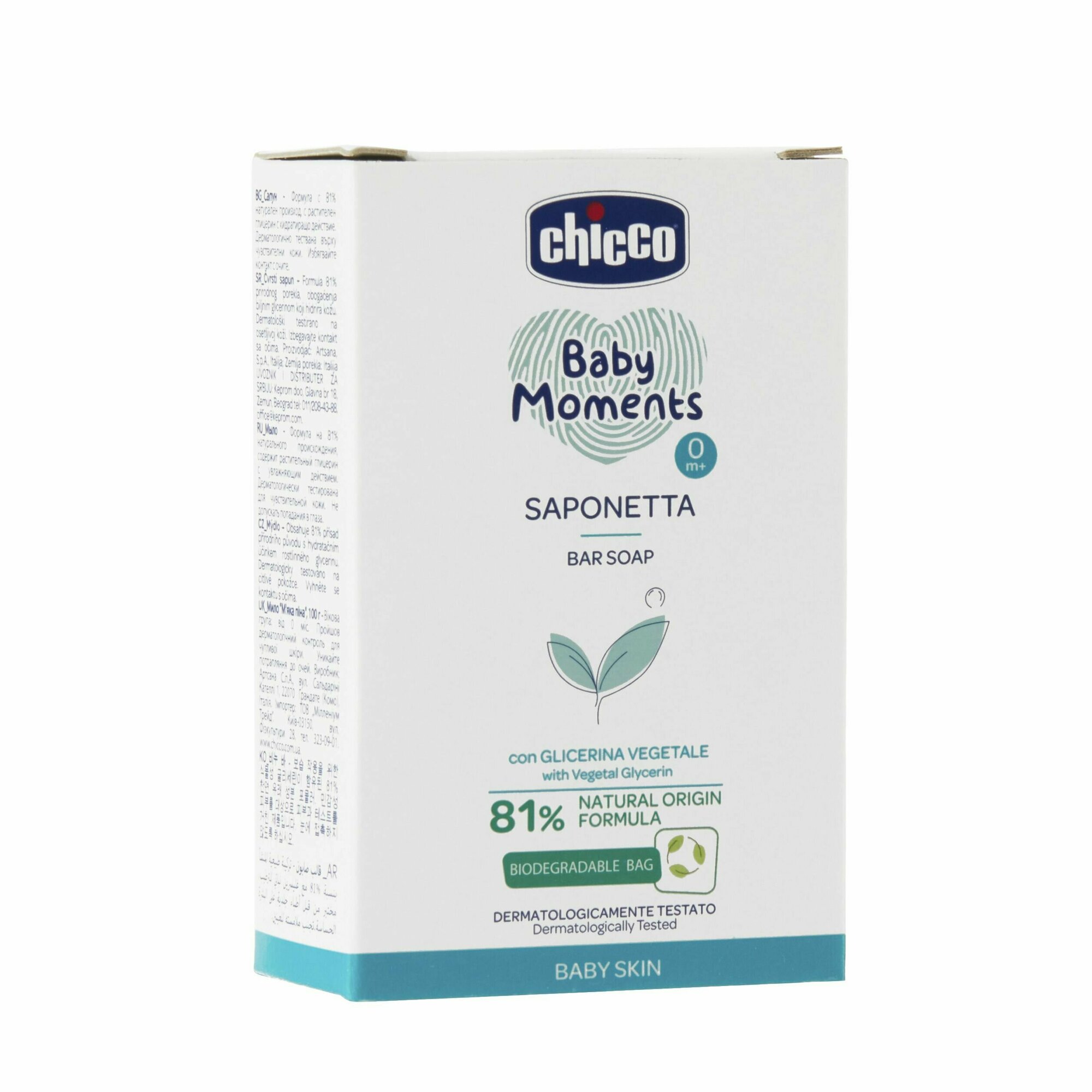 Детское мыло Chicco "Baby Moments" мягко очищает и увлажняет кожу малыша благодаря своей формуле с глицерином. Не содержит парабенов, лаурилсульфат натрия, красителей и спирт. Клинически протестировано на чувствительной коже. Гипоалергенное (формула для минимизации риска возникновения кожной аллергии).