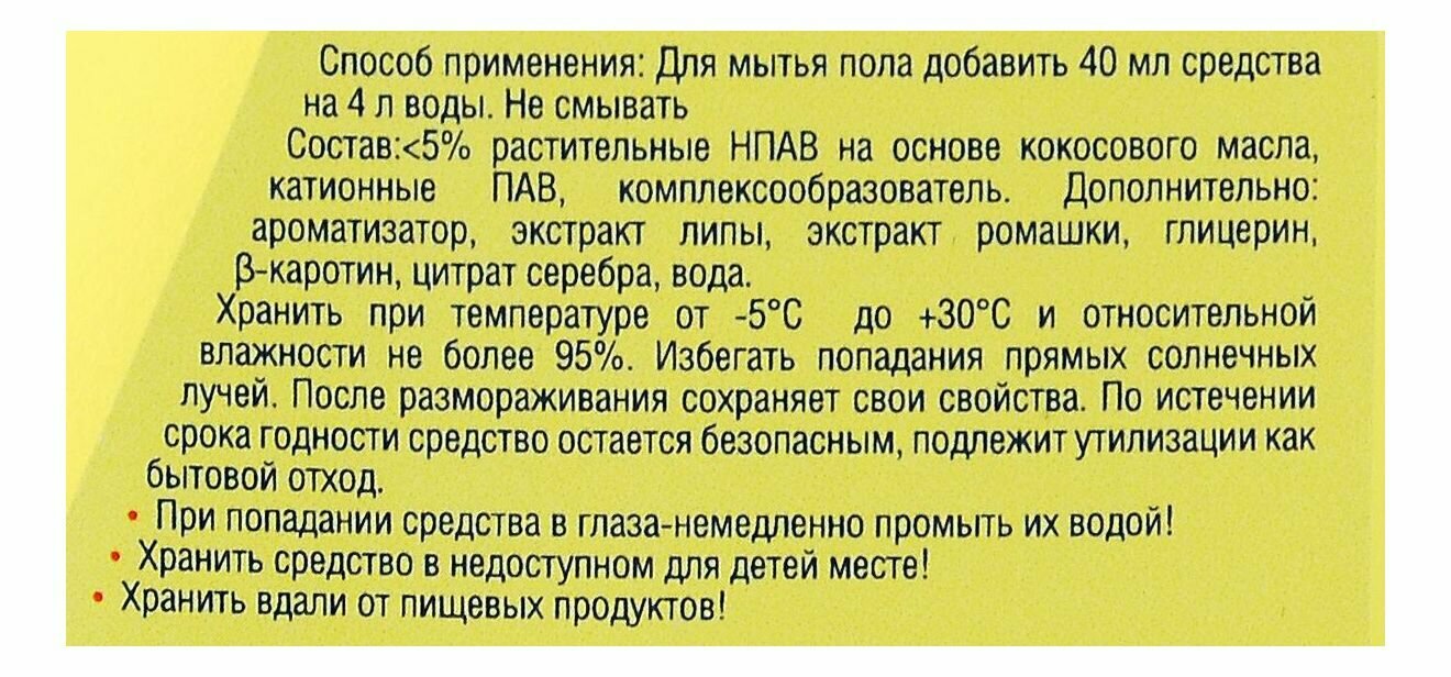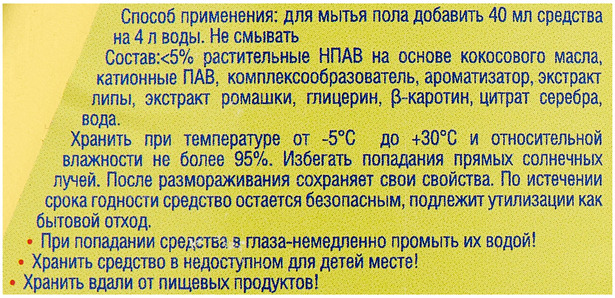 | Способ применения | для мытья пола добавить 40 мл средства на 4л воды. не смывать. |